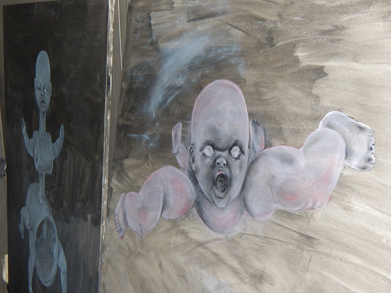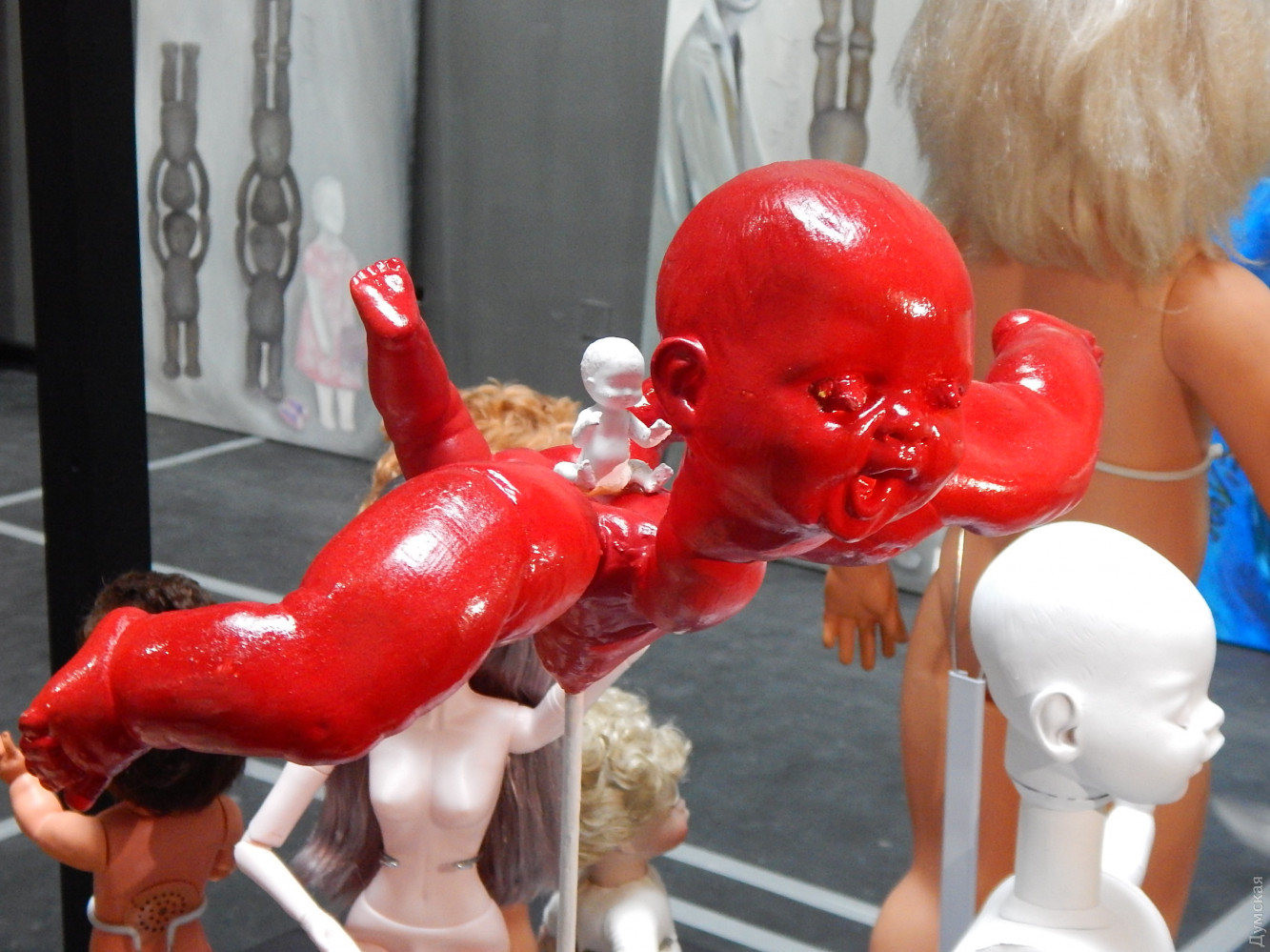 У стен стояли картины. С них на меня смотрели мертвые, а может безмятежно отстраненные личики кукол. Некоторые картины вызывали трепет своей инфернальностью. На полу лежали руки и ноги кукол.