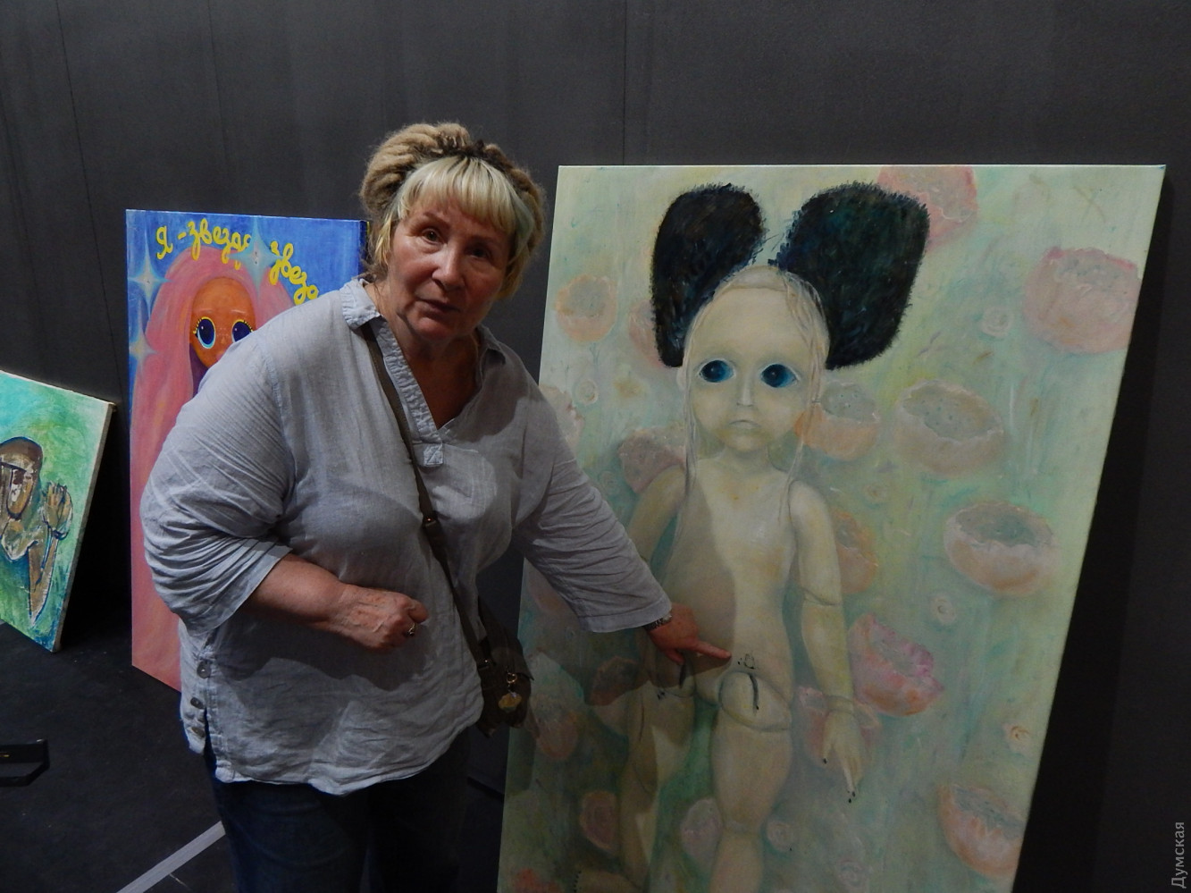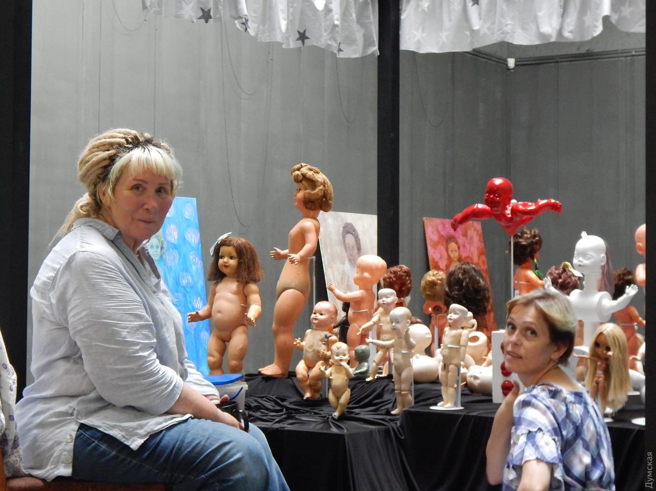 «У нас 20 особых историй. Если бы куклы были живые, они бы свидетельствовали о тех страшных переломных временах, которые пережили наши участницы. Самая первая история, рассказанная художником бутафором Натальей Царевой. В 30-е годы были страшные «зачистки» в Одессе. Арестовали мужчину. Его жене следователь предложил вступить в сексуальные отношения, дескать тогда его освободят», — рассказывает организатор выставки художник Ирина Вишневская.