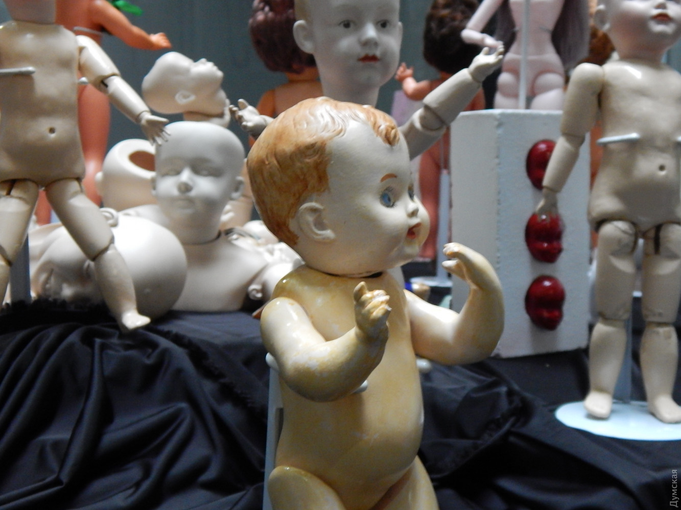 Старинных кукол на выставку предоставили Лена и Сергей Филипповы — коллекционеры кукол. Они давно мечтают о Музее игрушек в Одессе. Они серьезно подходят к делу. Проехались по 25 музеям в Европе со схожей тематикой, так сказать, для обмена опытом. И с удовольствием участвуют в музейных проектах. Их куклы почтенного возраста чуть поблекшие, с трещинками и выцветшими ручками и ножками, да еще и раздетые (таково условие участия в выставке) смотрятся среди чудовищных мутаций Сергея Коняхина, как грешники в аду.