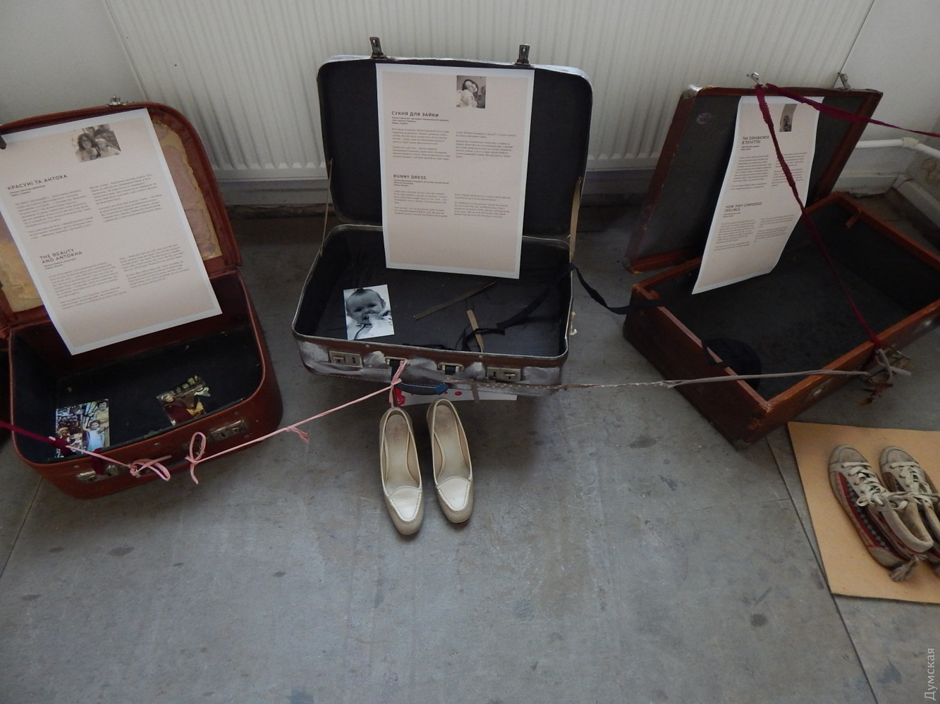 Стояли распахнутые чемоданы. Рядом прикрученные шурупами (дабы никто не уволок) старые башмаки и туфельки. Чемоданы — это символ путешествия и обувь, как символ пройденного пути. Причем, каждая из пар обуви, используемая в инсталляции, принадлежит героиням, рассказавшим свои истории.