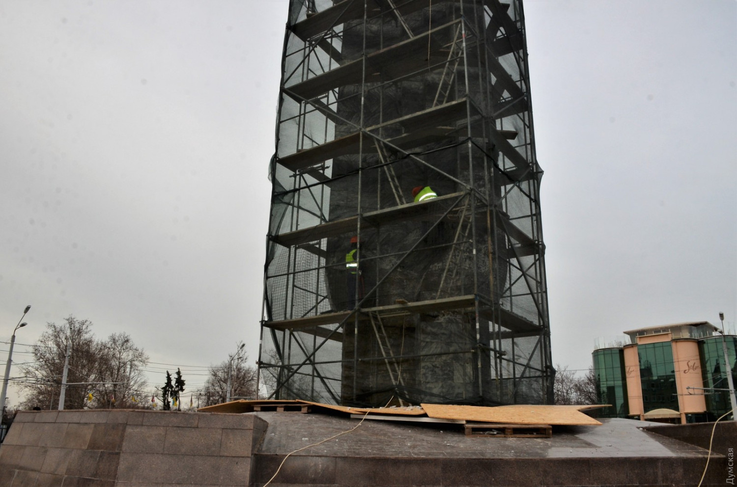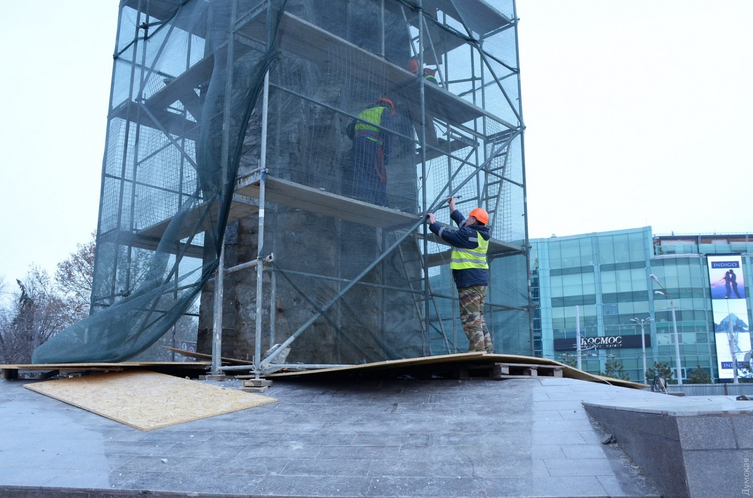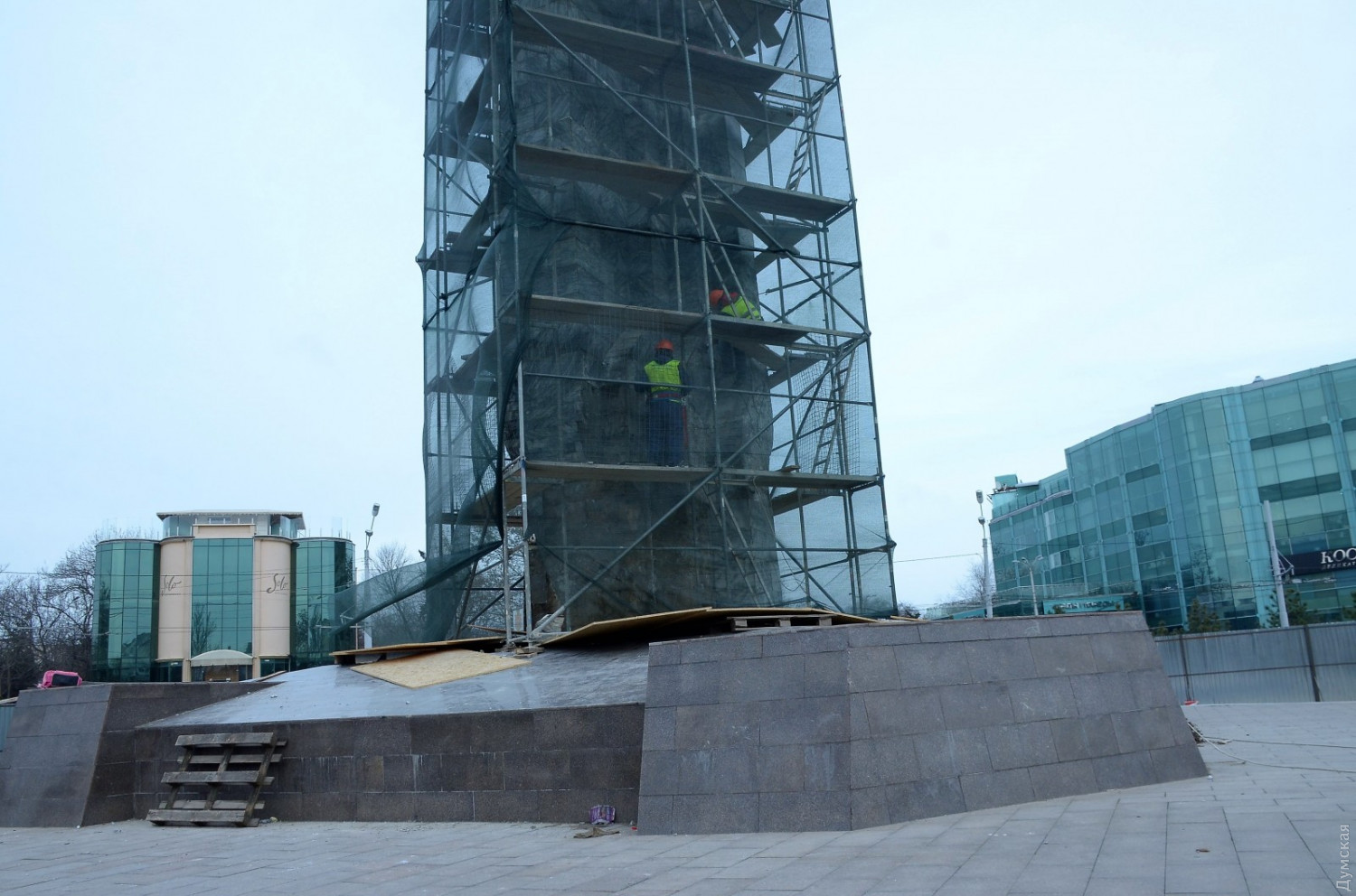 На обелиске «Крылья Победы», что на площади 10-го Апреля в Одессе, вместо раскрошившихся мраморных плит установят светло-серые керамогранитные плиты Laminam Arabescato Lucidato, качество и внешний вид которых соответствует современным требованиям.