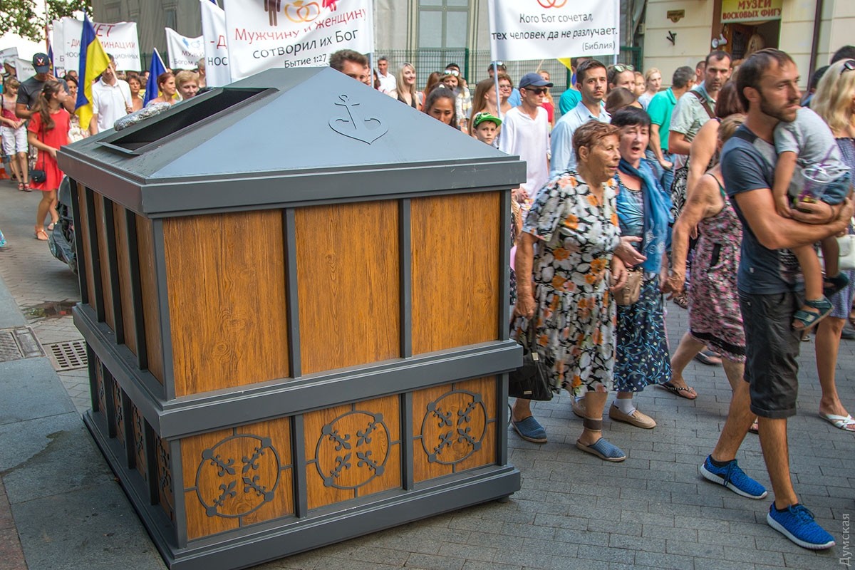 Мусорные баки в историческом центре Одессы начали прятать в декоративные «футляры». В частности, такие объекты наш корреспондент видел сегодня на Приморском бульваре. Внутри находится обычный альтфатер.