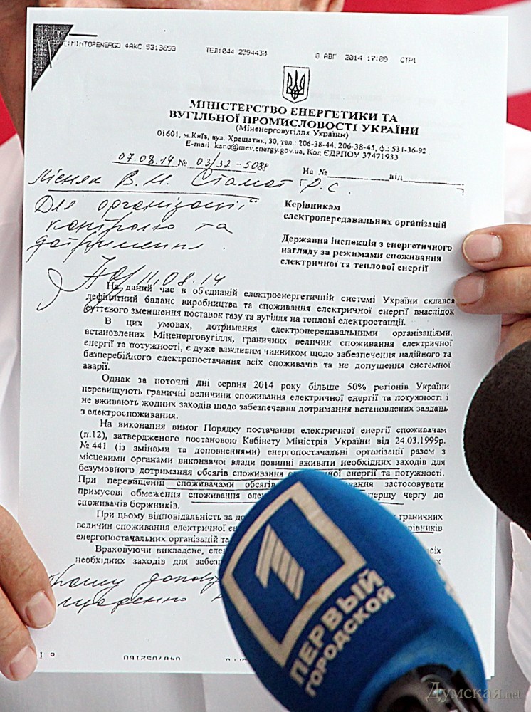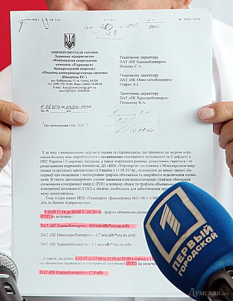 С 11 августа в Одесской области для юридических лиц введены ограничения, с тем, чтобы выполнить спущенные Министерством энергетики и угольной промышленности графики экономии электроэнергии. Об этом на пресс-конференции рассказал председатель правления ОАО «Одессаоблэнерго» Иван Поливяный.
