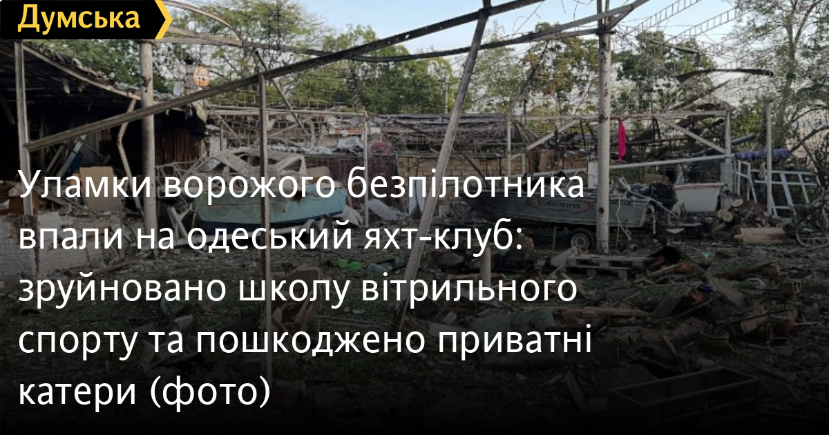 Уламки ворожого безпілотника впали на одеський яхт-клуб: зруйновано школу вітрильного спорту та пошкоджено приватні катериУламки ворожого безпілотника, збитого українськими захисниками цієї ночі, впали на території одеського яхт-клубу. Як повідомили в командуванні Сил оборони півдня України, внаслідок падіння зруйновано будівлю школи вітрильного спорту та ангар для зберігання майна. Також пошкоджено приватні катери та яхти. Ніхто з людей не постраждав. Загалом уночі окупанти випустили з кримського мису Чауда шість дронів-камікадзе типу Shahed-136, які заходили на удар по Одеській області з акваторії Чорного моря. Усі безпілотники були збиті силами протиповітряної оборони. Пізніше з літаків тактичної авіації було спрямовано ракету Х-59, яку наші захисники знищили в небі над Миколаївською областю. СМЕРТЬ РОСІЙСЬКИМ ОКУПАНТАМ! Помітили помилку? Виділяйте слова з помилкою та натискайте control-enter Новини по цій темі: 1 січня: Наслідки нічного удару: ворог пошкодив причали, техніку та обладнання в двох портах Одещини 1 січня: Нічний удар по Одещині: пошкоджено енергетичну інфраструктуру та житлові будинки (фото, відео) 31 грудня 2025: Новорічний наліт: Одеса під ударом російських шахедів 25 грудня 2025: Ворог вночі атакував Одеську область: одна людина загинула, двоє отримали поранення (фото) |