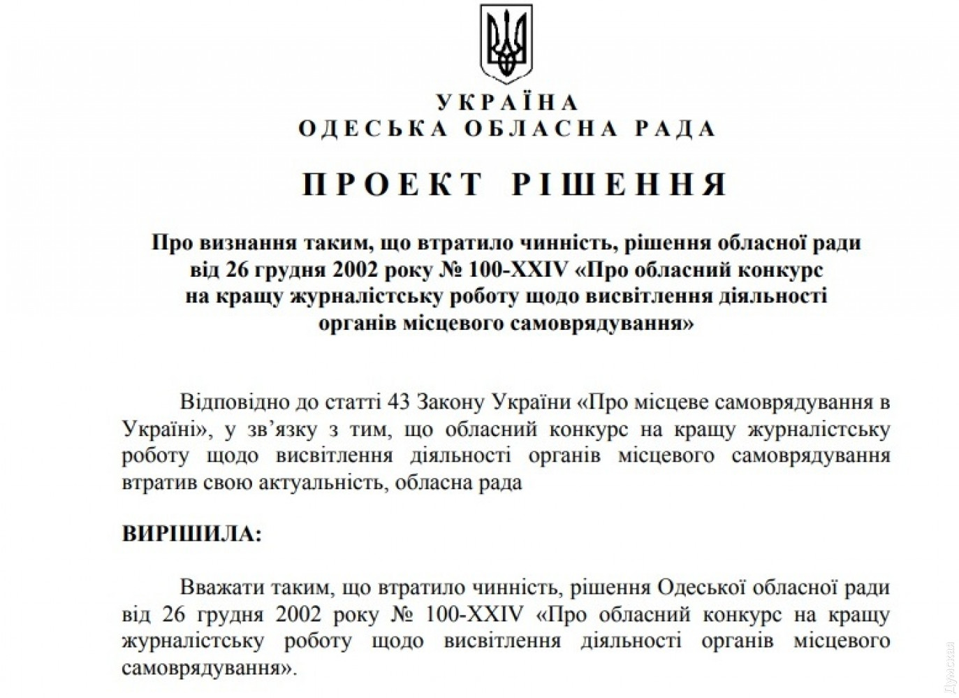 Облсовет упразднит проводившийся с 2002 года конкурс журналистских работ – это не демократичноОблсовет больше не будет проводить конкурс журналистских работ по освещению деятельности органов местного самоуправления. Соответствующий проект решения выносится на ближайшую сессию. В пояснительной записке говорится, что в демократичной стране подобный конкурс, который проводился с 2002 года, потерял актуальность. «Данная методика взаимодействия органов власти и средств массовой информации устарела и вызывает критику большинства независимых СМИ, которые играют важную роль в становлении общественного мнения и влияют на социально-политические процессы в Одесском регионе», — говорится в пояснительной записке к проекту решения. СМЕРТЬ РОСІЙСЬКИМ ОКУПАНТАМ! Помітили помилку? Виділяйте слова з помилкою та натискайте control-enter |
