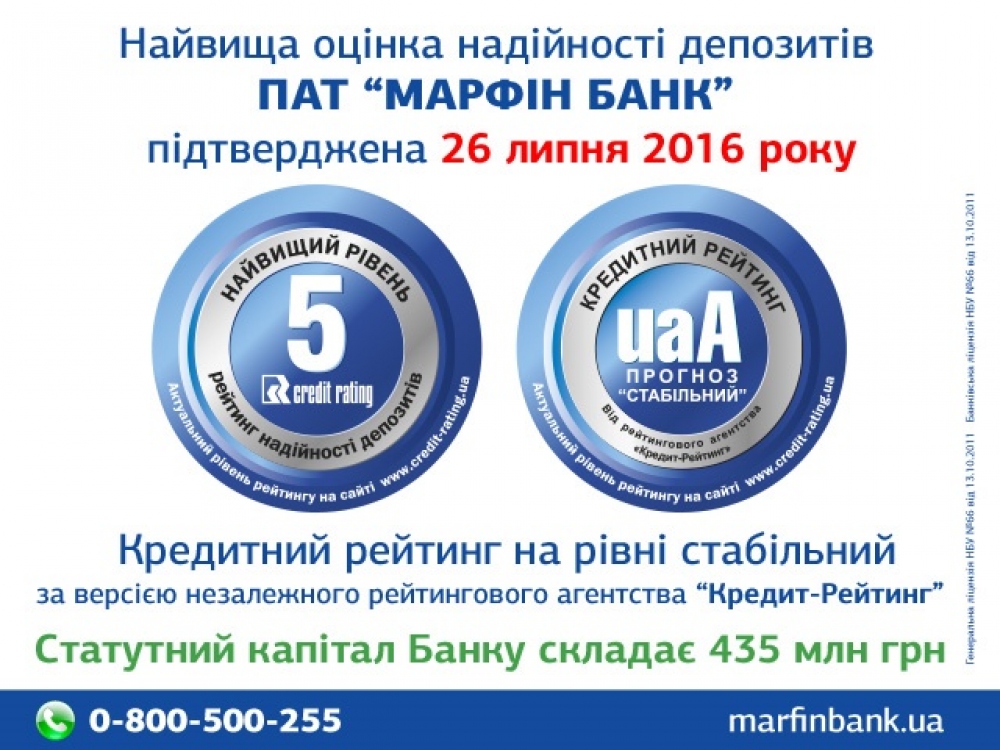 Обновлен депозитный рейтинг ПАО «Марфин банк»: высшая оценка «5» (на правах рекламы)26 июля 2016 года независимое рейтинговое агентство (РА) «Кредит-Рейтинг» в очередной раз подтвердило рейтинг надежности депозитов Публичного акционерного общества «Марфин банк» на наивысшем уровне — оценка «5». Высокая оценка рейтинга депозитов ПАО «Марфин банк» подкреплена традиционными показателями рентабельности, достаточности капитала, системности банка. Ранее, 23 июня 2016 года, РА «Кредит-Рейтинг» подтвердило и долгосрочный кредитный рейтинг ПАО «Марфин банк» на уровне uaА. Прогноз рейтинга — стабильный, что указывает на отсутствие предпосылок для его изменения на протяжении 2016 года. Уже в течение нескольких лет, начиная с 2009 года, банк сохраняет высокие рейтинговые позиции, что говорит о ПАО «Марфин банк» как о надежном партнере и имеющем перспективы в развитии финансовом учреждении. Банк выдерживает все нормативы НБУ и всегда выполнял и выполняет взятые на себя обязательства своевременно и в полном объеме. ПАО «Марфин банк» не привлекает ресурсы других банков на межбанковском рынке, отсутствует рефинансирование и стабилизационные кредиты от НБУ, что положительно влияет на высокие рейтинговые оценки. Уставной капитал ПАО «Марфин банк» составляет 435 миллионов гривен. По состоянию на 30 июня 2016 года банк получил прибыль в размере 12 миллионов 100 тысяч гривен. Рейтинги, присвоенные агентством, пересматриваются на регулярной основе. Информация обо всех рейтингах, присвоенных агентством «Кредит-Рейтинг», находится в информационных системах REUTERS, BLOOMBERG, S&P Capital IQ и TRData. СМЕРТЬ РОСІЙСЬКИМ ОКУПАНТАМ! Помітили помилку? Виділяйте слова з помилкою та натискайте control-enter |