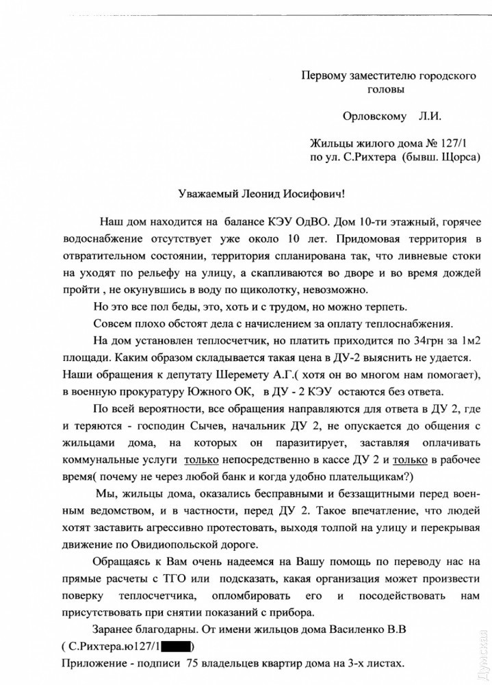 Жильцы многоквартирного дома грозятся перекрыть Овидиопольскую дорогу из-за коммунального беспределаЖители 10-этажного дома №127/1 по улице Святослава Рихтера (бывшая Щорса) недовольны качеством коммунальных услуг и заявляют, что власти их игнорируют, толкая на протесты. Об этом говорится в обращении жильцов на имя первого вице-мэра Одессы Анатолия Орловского. Дом находится на балансе квартирно-эксплуатационного управления Одесского военного округа. Претензии людей касаются многолетнего отсутствия горячего водоснабжения, неудовлетворительного состояния придомовой территории (двор постоянно затапливает), счетов за отопление (несмотря на наличие счетчика, оплату начисляют по тарифу 34 грн за квадратный метр) и управляющей организации ДУ-2. Руководство последней, отмечается в обращении, заставляет оплачивать услуги только в определенные часы и только через ДУ, что доставляет неудобства. «Мы, жильцы дома, оказались бесправными и беззащитными перед военным ведомством, в частности, перед ДУ-2. Такое впечатление, что людей хотят заставить агрессивно протестовать, выходя толпой на улицу и перекрывая Овидиопольскую дорогу», — подчеркивает автор письма В.Василенко. Под обращением поставили подписи 75 владельцев квартир. СМЕРТЬ РОСІЙСЬКИМ ОКУПАНТАМ! Помітили помилку? Виділяйте слова з помилкою та натискайте control-enter |