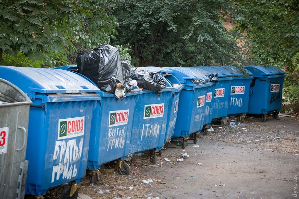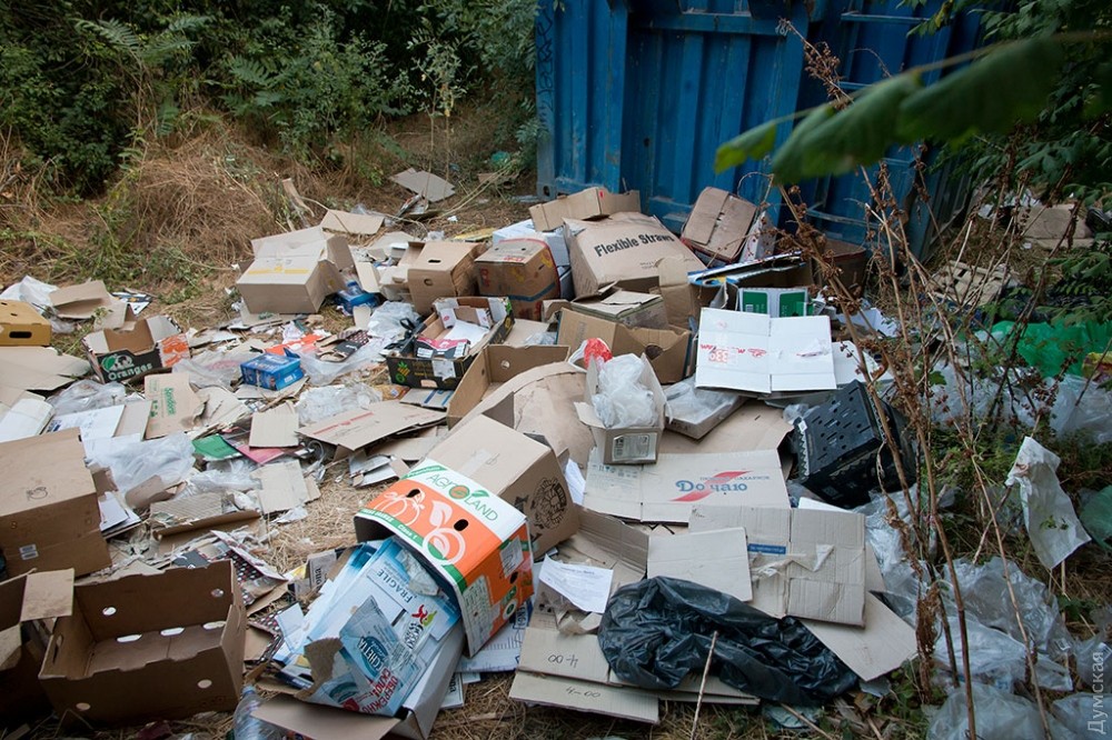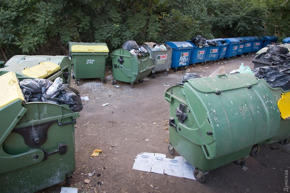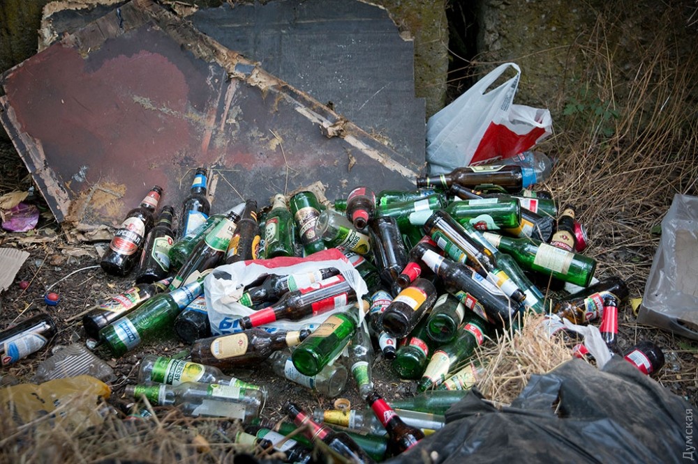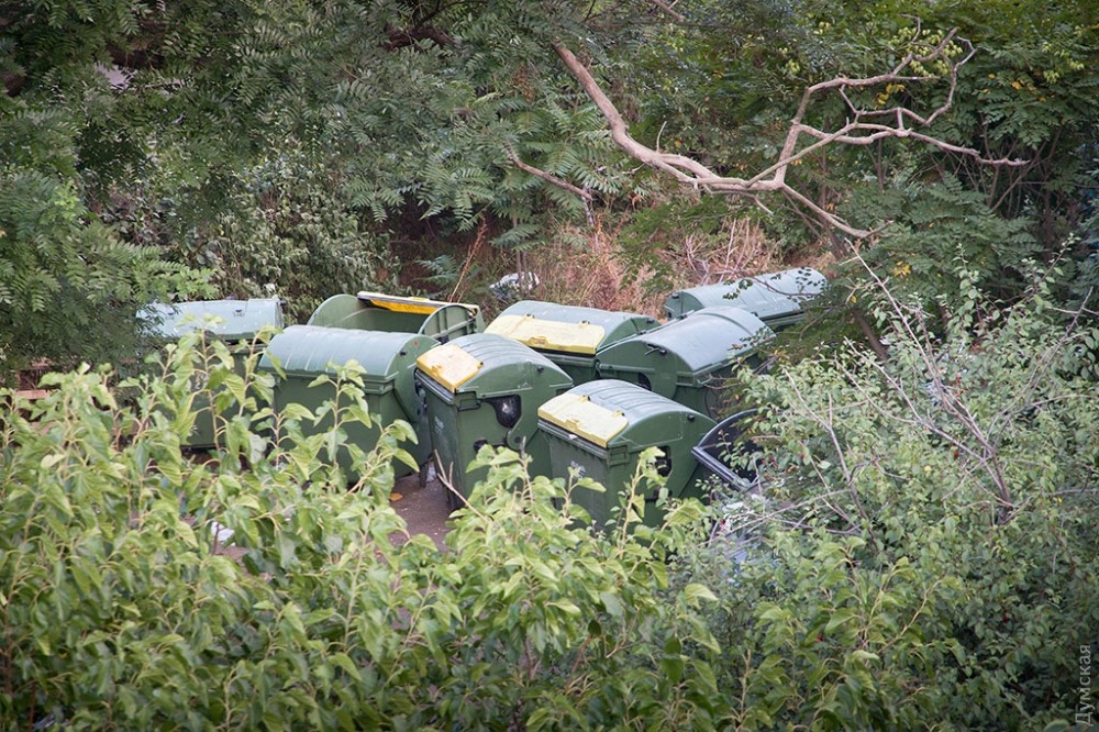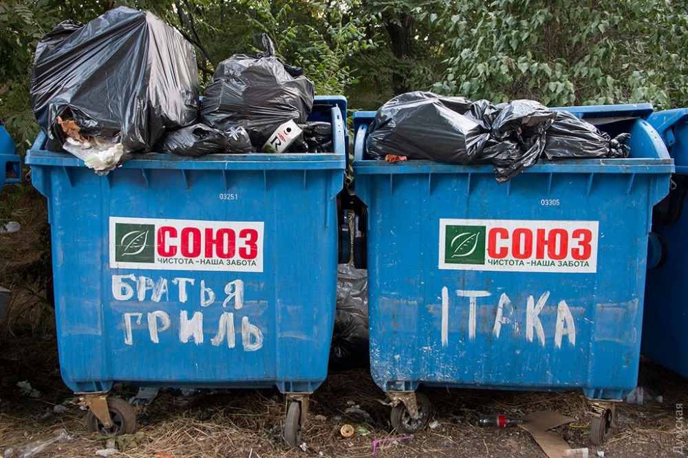 Редко кто задумывается об обратной стороне праздника, тем более, если он такой масштабный и круглосуточный, как самый известный одесский пляж и одновременно огромный ночной клуб — Аркадия. А ведь место, которое ежедневно посещает несколько тысяч, если не десятков тысяч одесситов и гостей города должно производить не только положительные эмоции, но и отходы. Как выяснил корреспондент «Думской», под мусорные контейнеры отведен огромный участок зеленой зоны прямо на склонах, в 20 метрах от Трассы здоровья. Здесь, возле входа в бывшее бомбоубежище, расположилось в тени акаций более 30 контейнеров. Большинство из них именные — на грязных пластиковых боках красуются названия увеселительных заведений и коммунального учреждения «Побережье». При этом часть мусора разлагается прямо на траве.