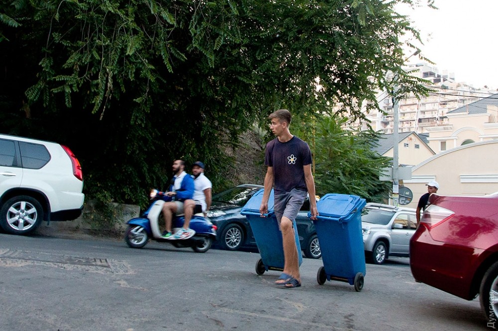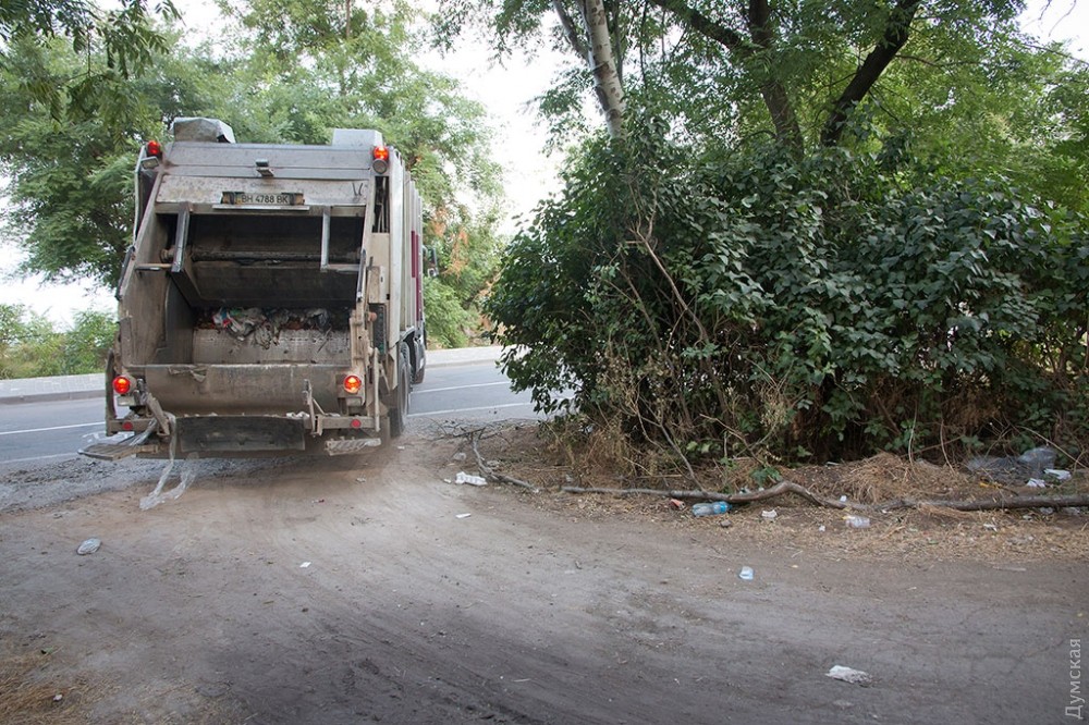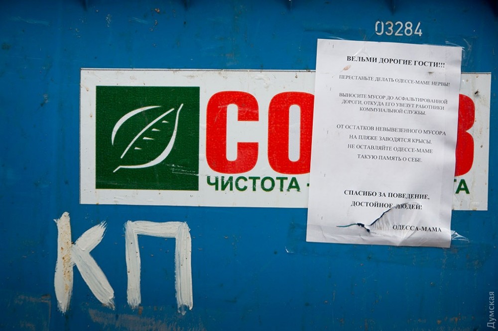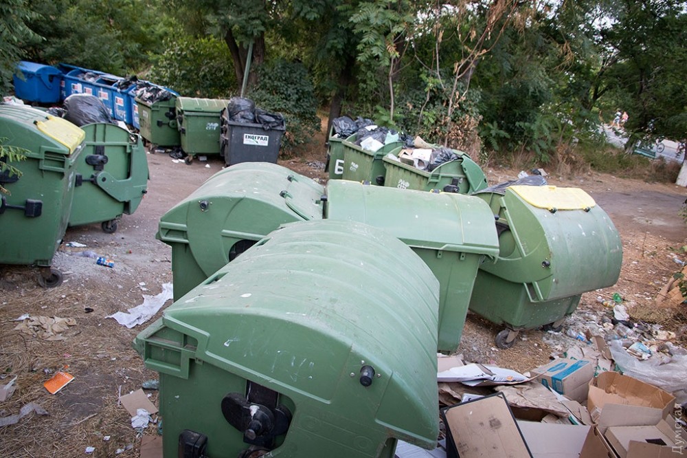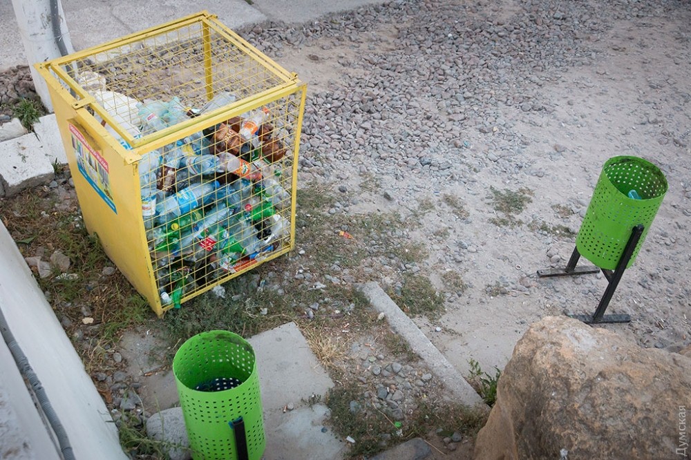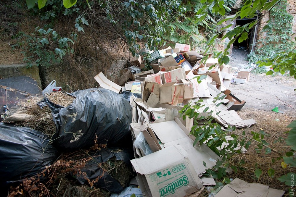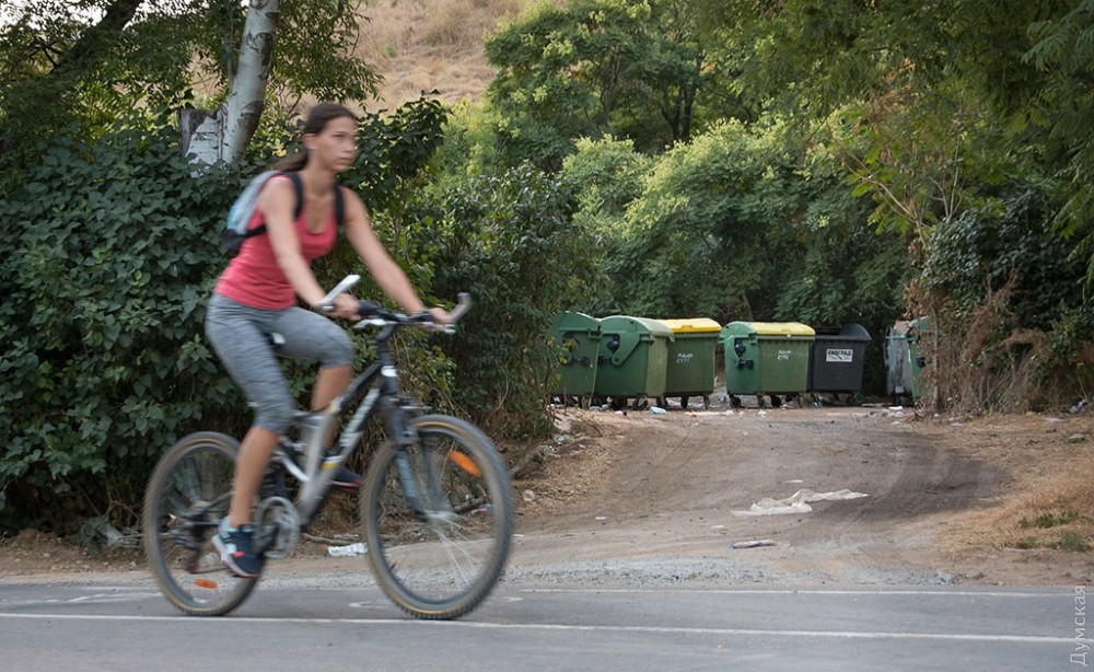 Редко кто задумывается об обратной стороне праздника, тем более, если он такой масштабный и круглосуточный, как самый известный одесский пляж и одновременно огромный ночной клуб — Аркадия. А ведь место, которое ежедневно посещает несколько тысяч, если не десятков тысяч одесситов и гостей города должно производить не только положительные эмоции, но и отходы. Как выяснил корреспондент «Думской», под мусорные контейнеры отведен огромный участок зеленой зоны прямо на склонах, в 20 метрах от Трассы здоровья. Здесь, возле входа в бывшее бомбоубежище, расположилось в тени акаций более 30 контейнеров. Большинство из них именные — на грязных пластиковых боках красуются названия увеселительных заведений и коммунального учреждения «Побережье». При этом часть мусора разлагается прямо на траве.