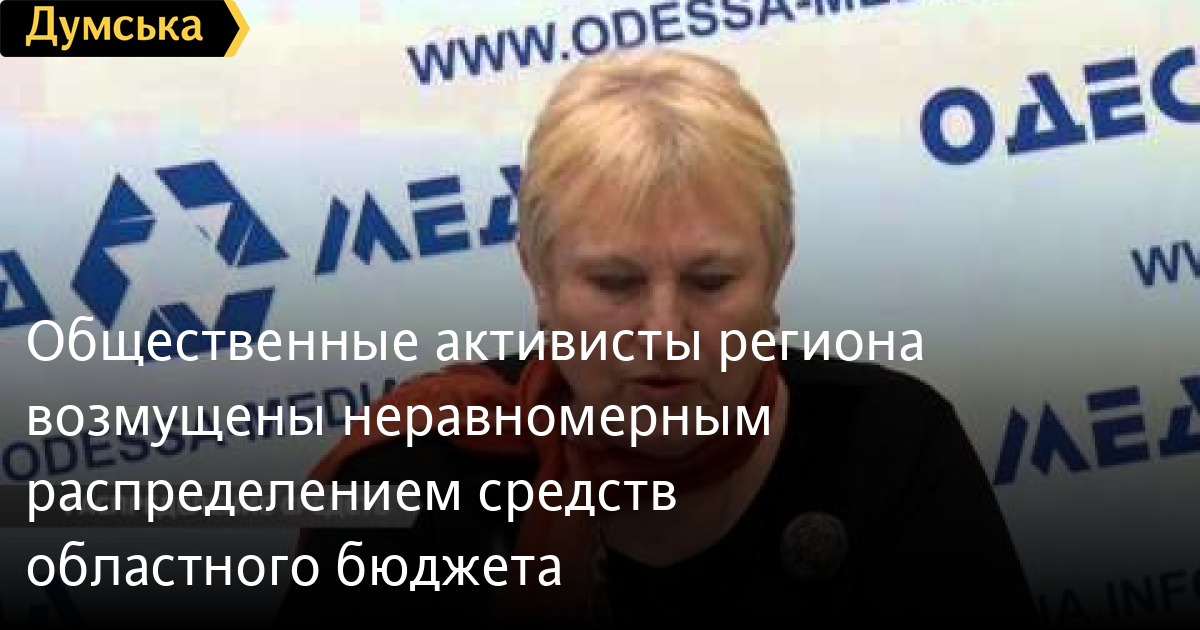 Общественные активисты региона возмущены неравномерным распределением средств областного бюджетаС требованием разъяснить, по каким принципам депутаты Одесского областного совета распределяли бюджетные средства между районами, выступили общественные активисты. Они убеждены – деньги выделяли по принципу лоббирования интересов конкретных населенных пунктов, а не исходя из реальных проблем в области. СМЕРТЬ РОССИЙСКИМ ОККУПАНТАМ! Заметили ошибку? Выделяйте слова с ошибкой и нажимайте control-enter Думская ТВ. Сюжеты: