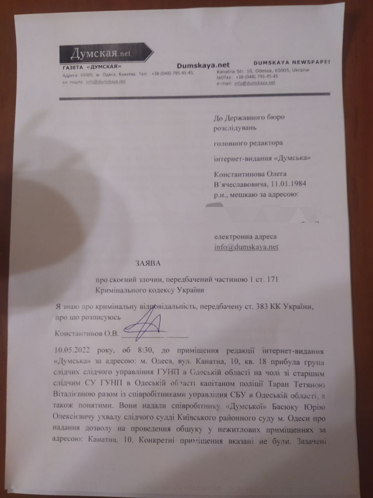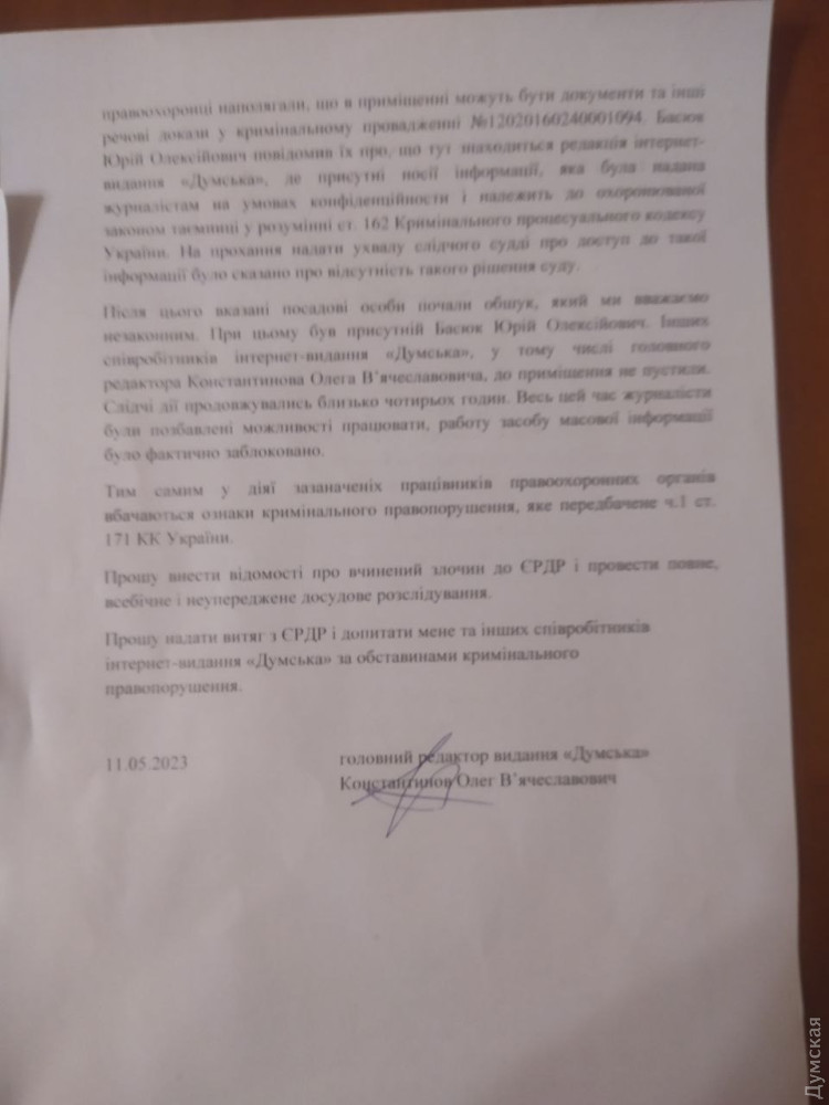 Обшук у редакції «Думської»: головний редактор заявив про скоєний співробітниками поліції та СБУ злочин👍 300 💩 39 😁 21 😱 7 ❤ 6 🤬 5 Заяву про злочин, передбачений 171-ю статтею Кримінального кодексу України (перешкоджання законній професійній діяльності журналістів), подав головний редактор інтернет-видання «Думська» Олег Константинов. Нагадаємо, вранці 10 травня до редакції нашого видання прийшли з обшуком співробітники поліції та СБУ. Вони на кілька годин заблокували роботу «Думской», крім того, обшукували приміщення, в яких знаходяться носії інформації з конфіденційною інформацією, використання якої передбачає журналістська робота. Судової ухвали на доступ до такої інформації в них не виявилося. Далі наводимо текст заяви головного редактора повністю: ЗАЯВА про скоєний злочин, передбачений частиною 1 ст. 171 Кримінального кодексу України Я знаю про кримінальну відповідальність, передбачену ст. 383 КК України, про що розписуюсь Константинов О.В. _________________ 10.05.2023 року, об 8:30, до приміщення редакції інтернет-видання «Думська» за адресою: м. Одеса, вул. Канатна, 10, кв. 18 прибула група слідчих слідчого управління ГУНП в Одеській області на чолі зі старшим слідчим СУ ГУНП в Одеській області капітаном поліції Таран Тетяною Віталієвною разом із співробітниками управління СБУ в Одеській області, а також понятими. Вони надали співробітнику «Думської» Басюку Юрію Олексієвичу ухвалу слідчого судді Київського районного суду м. Одеси Федулеєвої Ю.О. про надання дозволу на проведення обшуку у нежитлових приміщеннях за адресою: Канатна, 10. Конкретні приміщення вказані не були. Зазачені правоохоронці наполягали, що в приміщенні можуть бути документи та інші речові докази у кримінальному провадженні №12020160240001094. Басюк Юрій Олексійович повідомив їх про те, що тут знаходиться редакція інтернет-видання «Думська», де присутні носії інформації, яка була надана журналістам на умовах конфіденційності і належить до охоронюваної законом таємниці у розумінні ст. 162 Кримінального процесуального кодексу України. На прохання надати ухвалу слідчого судді про доступ до такої інформації було сказано про відсутність такого рішення суду. Після цього вказані посадові особи почали обшук, який ми вважаємо незаконним. При цьому був присутній Басюк Юрій Олексійович. Інших співробітників інтернет-видання «Думська», у тому числі головного редактора Константинова Олега В’ячеславовича, до приміщення не пустили. Слідчі дії продовжувались близько чотирьох годин. Весь цей час журналісти були позбавлені можливості працювати, работу засобу масової інформації було фактично заблоковано. Тим самим у діях зазначених працівників правоохоронних органів вбачаються ознаки кримінального правопорушення, яке передбачене ч.1 ст. 171 КК України. Прошу внести відомості про вчинений злочин до ЄРДР і провести повне, всебічне і неупереджене досудове розслідування. Прошу надати витяг з ЄРДР і допитати мене та інших співробітників інтернет-видання «Думська» за обставинами кримінального правопорушення. Додатки: копія ухвали судді Федулеєвої Ю.О., протокол обшуку. 11.05.2023 Головний редактор видання «Думська» Константинов Олег В’ячеславович Константинов надіслав цю заяву до Державного бюро розслідувань. Його співробітники мають протягом доби внести відомості до Єдиного реєстру 