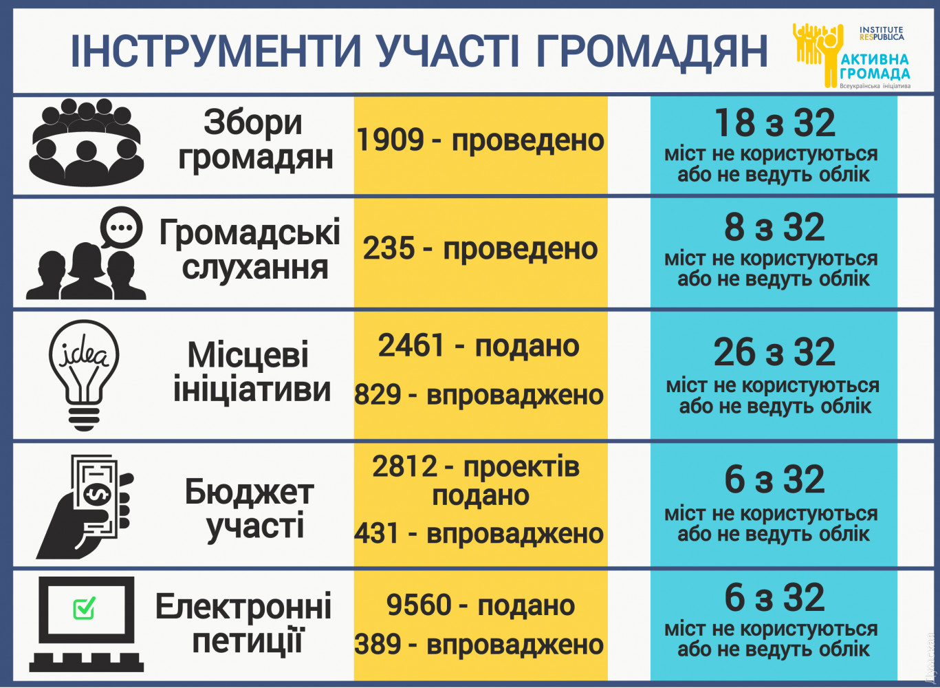 В рамках исследования инструментов участия граждан в принятии решений Одесса оказалась лидером в проведении собраний граждан. Исследование организовала всеукраинская общественная организация «Институт «Республика» в 32 городах Украины. Всего в населенных пунктах Украины состоялось 1909 собраний граждан, из них рекордное количество в Одессе — 1522, что составляет 80% от общего количества. «Один из новых инструментов участия, которые мы внедряем в Одессе — это публичные консультации. К примеру, сейчас власть консультируется с общественностью по выбору лучшего макета памятника Небесной сотне, который установят возле Одесской областной государственной администрации. Мы надеемся, что данный опыт станет успешным, и в дальнейшем уже Одесский городской совет начнет его использовать, а у одесситов появится еще один инструмент влияния на власть», — говорит региональный координатор всеукраинской инициативы «Активная Громада» от «Института «Республика» в Одессе Юлия Чухало. Отметим, данные были взяты из ответов на запросы в местные советы в следующих городах: Богуслав, Винница, Горишние Плавни, Днепр, Доброполье, Дрогобыч, Житомир, Жмеринка, Запорожье, Зеньков, Знаменка, Ивано-Франковск, Каменец-Подольский, Киев, Коломыя, Краматорск, Кременная, Кропивницкий, Львов, Одесса, Полтава, Ровно, Рубежное, Скадовск, Сумы, Тернополь, Ужгород, Харьков, Хмельницкий, Черкассы, Черновцы, Южный. СМЕРТЬ РОСІЙСЬКИМ ОКУПАНТАМ! Помітили помилку? Виділяйте слова з помилкою та натискайте control-enter |