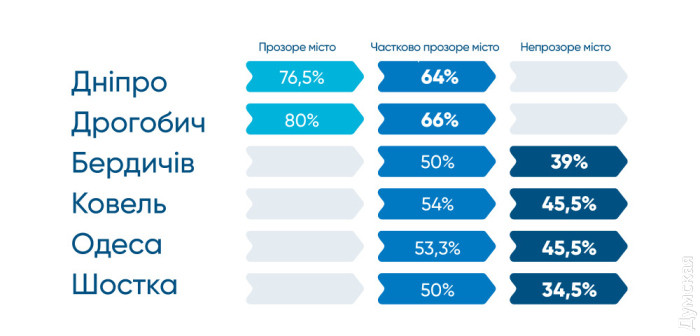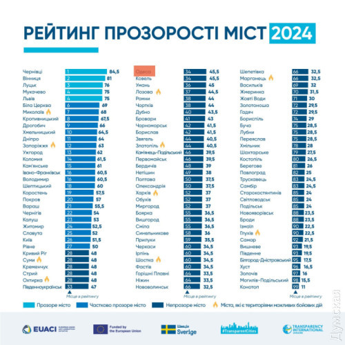 Мутне місто: мерія Одеси провалилася в рейтингу прозорості місцевої влади, а Миколаїв у десятці найкращихОдеса стала «непрозорим» містом, погіршивши показники відкритості влади порівняно з 2023 роком (з 53,3% до 45,5%). Водночас у трьох містах регіону ситуація ще гірша — Білгород-Дністровський, Південне та Ізмаїл — у найгіршій десятці, передає кореспондент «Думської», який вивчив доповідь Transparency International Ukraine. Експерти опублікували оновлений рейтинг 100 українських міст в умовах повномасштабної війни, доступність нашого міста нижча за середню по країні (59,1%). Оцінка проводилася за 70 критеріями — від відкритості сесій міськради до доступності даних про використання комунального майна. Лідерами стали Чернівці, Вінниця та Луцьк. Серед прифронтових міст відзначився Миколаїв — наш сусід у десятці найкращих. А ось Одеса, попри свої розміри, ресурси та амбіції, до списку прозорих, і навіть частково прозорих, потрапити не змогла. Місто невибагливо затесалося між Південноукраїнськом і Ковелем, посівши 34 сходинку. Ба більше, Одеса примудрилася опуститися: з частково прозорої стати непрозорою. Крім наші показники погіршили ще 6 міст. Із сотні. При цьому джерела «Думської» в мерії запевняють — змін у роботі муніципалітету не було, тож причини погіршення показників — у змінах підходів Transparency International Ukraine, чого ті й не приховують.
