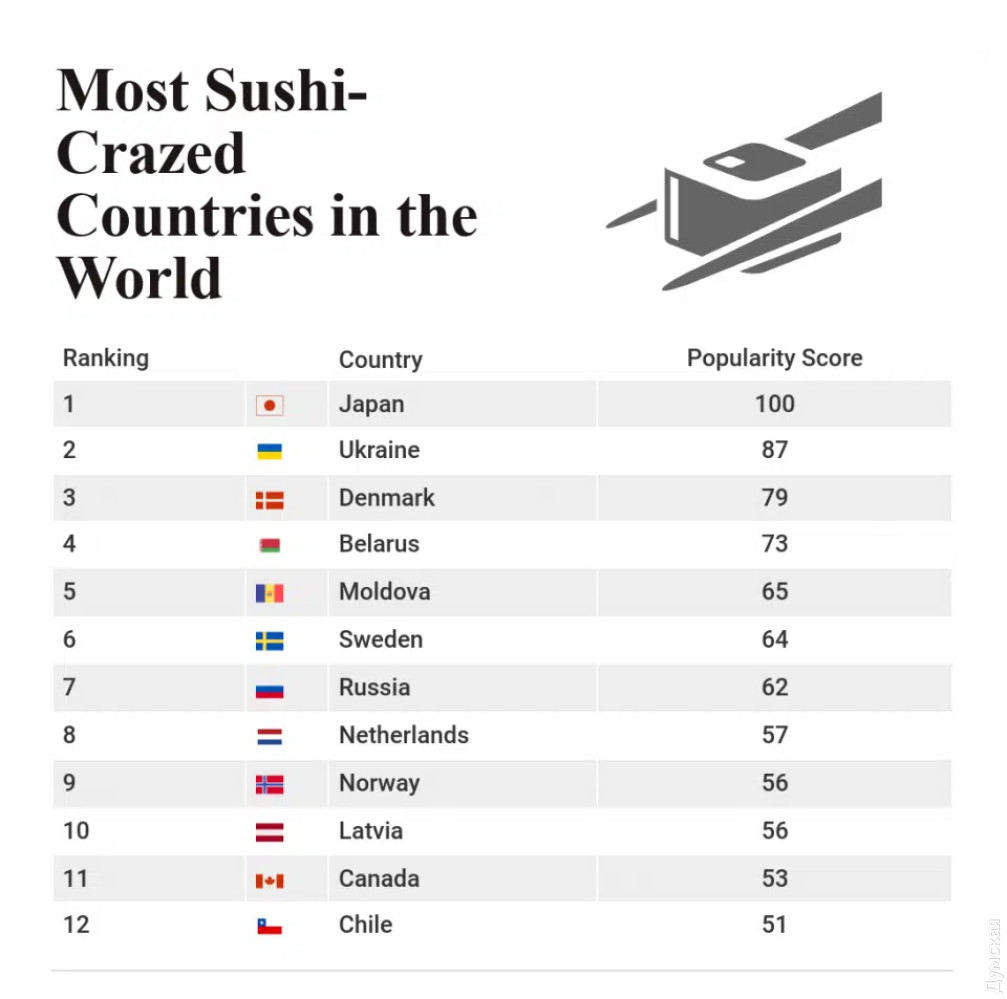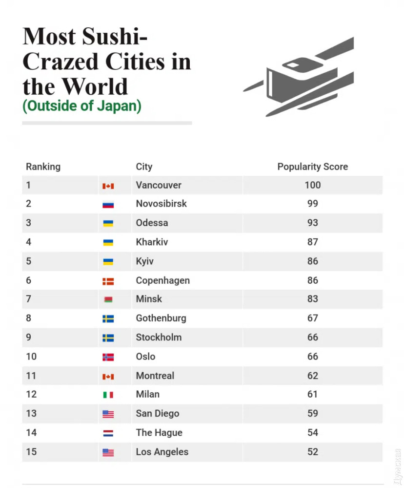 Одесса оказалась третьим в мире городом по популярности суши за границами ЯпонииОдесса находится на третьем месте в мире по популярности суши, не считая родины этого блюда – Японии. В рейтинге австралийского издания Chef’s Pencil наш город опережают только Ванкувер и Новосибирск. Интересно, что сразу за Одессой следует еще два украинских города – Харьков и Киев. В рейтинге стран Украина оказалась на втором месте после Японии по популярности суши. Чтобы выстроить рейтинг, австралийцы использовали данные сервиса Google Trend, с помощью которых подсчитали количество поисковых запросов в разных городах и странах. СМЕРТЬ РОСІЙСЬКИМ ОКУПАНТАМ! Помітили помилку? Виділяйте слова з помилкою та натискайте control-enter |