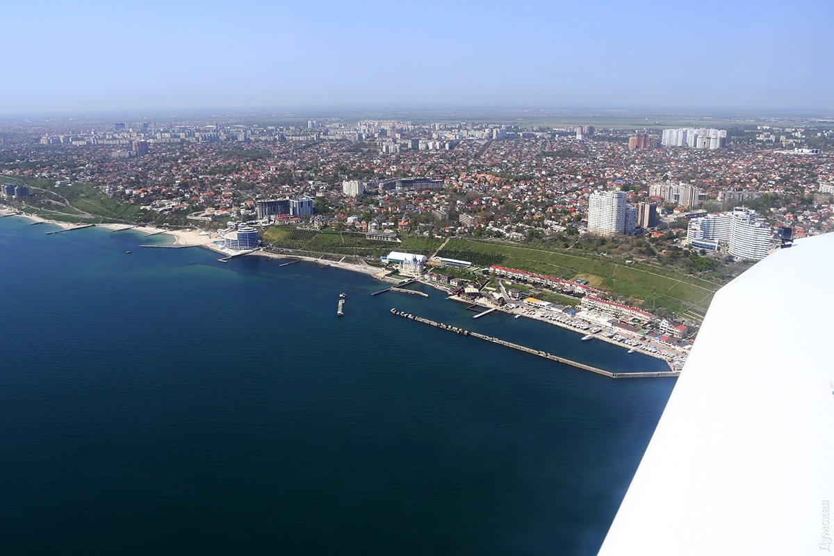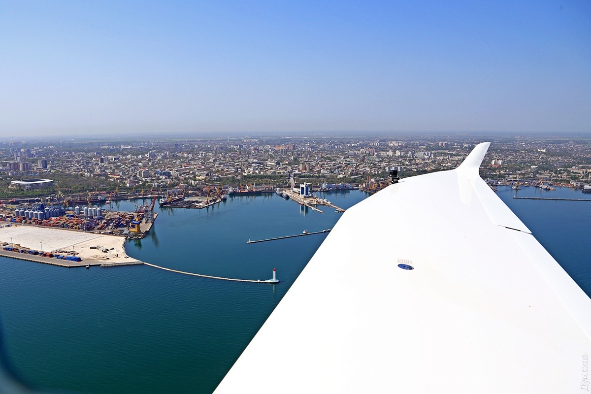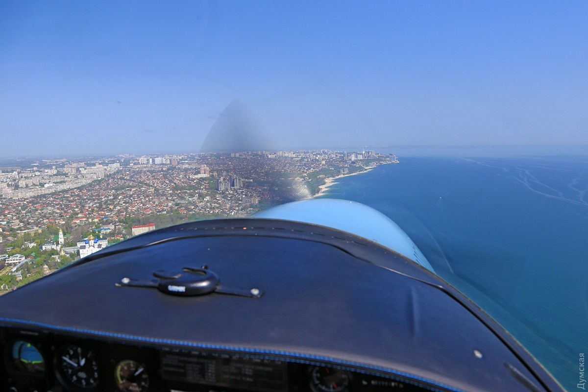 Одесса под крылом «Акулы»: как частная авиация пограничникам, экологам и спасателям помогаетОчерк корреспондента «Думской» Сергея Смоленцева, который полетал над Одессой вместе с добровольными помощниками пограничников и ГСЧС. Пилот внимательно смотрит на приборную доску и прислушивается к работе двигателя. Еще пара секунд для прогрева, после чего он энергично двигает РУД (ручку управления двигателем) вперед на взлетный режим. Децибелы бьют по ушам, летчик нагружает винт, отпускает тормоза, и самолет, слегка качнувшись, стремительно набирает скорость. Перегрузка вдавливает в кресло, пилот берет ручку на себя, еще секунда, и мы в воздухе. Легкий поршневой двухместный самолетик Aquila A210, бортовой UR-ACA, отправляется в небольшой утренний облет побережья с пригородного аэродрома Гидропорт, где базируется легкомоторная авиация одесского аэроклуба. В левом кресле — известный одесский пилот Вадим Громов. Погода сегодня – миллион на миллион, правда, где-то на горизонте все же видна небольшая дымка, но она ни разу не мешает, все видно, как на ладони. На носу самолетика нанесена шутливая аэрография — зубастая пасть нешуточного морского хищника, русское название которого созвучно названию фирмы–производителя. И хотя «аквила» переводится с латыни как «орел», летчики предпочитают называть эти машины «акулами». Так веселее и загадочнее… Доклад диспетчеру, ответные пожелания, и «Акула» после крутого правого виража оказывается над Куяльницким лиманом. Над границей земли и воды всегда немного потряхивает. Проходя на небольшой высоте через слои теплого и холодного воздуха, самолет из-за разности давлений попадает в воздушные ямы. Тяжелые лайнеры меньше подвержены такой тряске, а легкую «Акулу» бросает не только по высоте, но и по курсу движения. В общем, ничего страшного, к этому быстро привыкаешь, и через десять минут тряска воспринимается как неотъемлемая часть путешествия – так даже интереснее. Движемся над лиманом в сторону Одесского залива. С высоты 100 метров по цвету воды отчетливо видна разница глубин Куяльницкого и Хаджибейского лиманов. Желтовато-коричневая жижа под нами говорит о том, что Куяльник не глубже двух метров (а то и мельче), тогда как синяя в Хаджибее свидетельствует о намного больших отметках. Мы летаем не только развлечения ради. Летчики Всеукраинской общественной организации частных пилотов и владельцев воздушных судов (АОПА Украина) на волонтерских началах помогают спасателям, полиции и Государственной пограничной службе: полеты Aquila и другой подобной техники стоят на порядок дешевле, чем пограничных «Даймондов» и вертолетов. В хорошую погоду с высоты 1000 футов (около 330 метров) можно увидеть большие объекты – суда и здания на расстоянии 25-30 км. С помощью приборов пилоты дают точное целеуказание аварийным, техническим и оперативным службам. Вадим Громов рассказывает, что таким образом были спасены десятки людей, попавших в беду. Спасать удавалось тонущие яхты, катера и лодки с рыбаками и даже пляжников, унесенных ветром на надувных матрасах. Маленький, тихий, незаметный самолетик может вплотную подкрасться к морским судам, занимающимся контрабандой или незаконным ловом рыбы, и мгновенно передать эту информацию диспетчеру, который тут же поставит в известность заинтересованные службы. Летчики малой авиаци