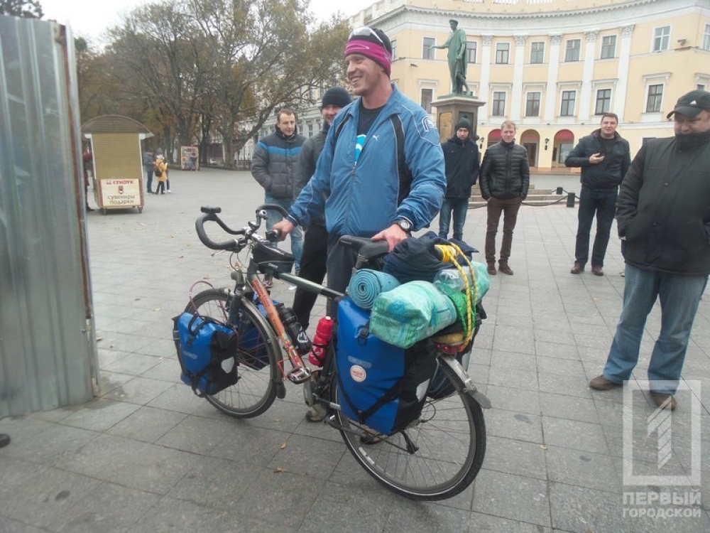 Сегодня от памятника Дюку одесский спортсмен Руслан Верин отправился в велопутешествие до Сингапура.