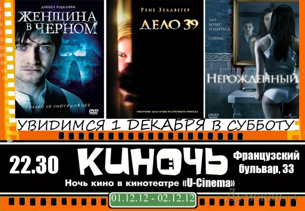 В кинотеатре «U-Cinema», что на Французском бульваре, в ближайшую субботу состоится киноночь. Мероприятие проводится пабликом «Одесса как она есть». Как сообщают организаторы, зрители увидят фильмы «Женщина в черном», «Дело №39» и «Нерожденный». Цена билета составляет 60 гривен. Начало киноночи – 1 декабря в 22:30. Забронировать билет можно здесь. Фильмы демонстрируются на русском языке. СМЕРТЬ РОСІЙСЬКИМ ОКУПАНТАМ! Помітили помилку? Виділяйте слова з помилкою та натискайте control-enter |