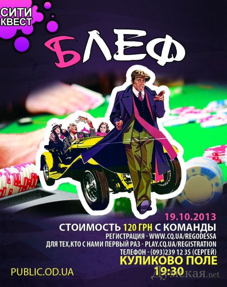 Одесситов приглашают на автоквест по мотивам фильма «Блеф» (на правах рекламы)В субботу, 19 октября, в Одессе пройдет автоквест на тему фильма с Адриано Челентано «Блеф». Как сообщают организаторы, сбор участников будет проходить на Куликовом поле в 19:30. Зарегистрироваться на игру можно здесь. Для тех, кто играет впервые, здесь. По всем вопросам также можно звонить по телефону 0932391235. Кроме автомобиля, команды должны взять с собой телефон с интернетом, карту Одессы, фонарики, письменные принадлежности и хорошее настроение. Напомним, суть подобных игр заключается в последовательном выполнении различных заданий. Цель задания — найти код, который позволит вашей команде перейти на следующий уровень. Победителем становится тот, кто первым выполнит все задания. СМЕРТЬ РОСІЙСЬКИМ ОКУПАНТАМ! Помітили помилку? Виділяйте слова з помилкою та натискайте control-enter |