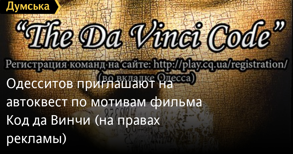 Одесситов приглашают на автоквест по мотивам фильма «Код да Винчи» (на правах рекламы)В субботу, 12 апреля, в Одессе пройдет автоквест на тему «Код да Винчи». Сбор участников, как обычно, назначен на 19:30 в Артиллерийском парке, со стороны Водопроводной. «Сити Квест – командная развлекательная игра в реальном мире, во время которой ваша команда будет решать загадки, перемещаться по городу и выполнять разные задания», — отмечают организаторы. Правила игры прежние – команду состоят из 3-5 человек. С собой нужно иметь: автомобиль, телефон с интернетом, письменные принадлежности, фонарики, карту города, фотоаппарат, логику и хорошее настроение. Зарегистрироваться на игру можно здесь. СМЕРТЬ РОССИЙСКИМ ОККУПАНТАМ! Заметили ошибку? Выделяйте слова с ошибкой и нажимайте control-enter |