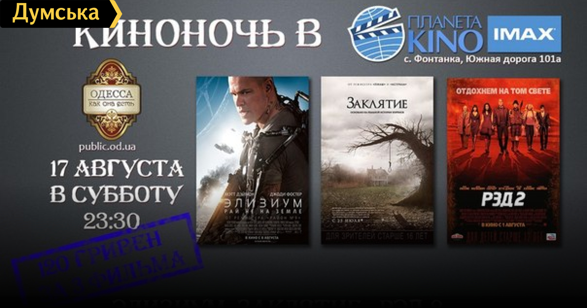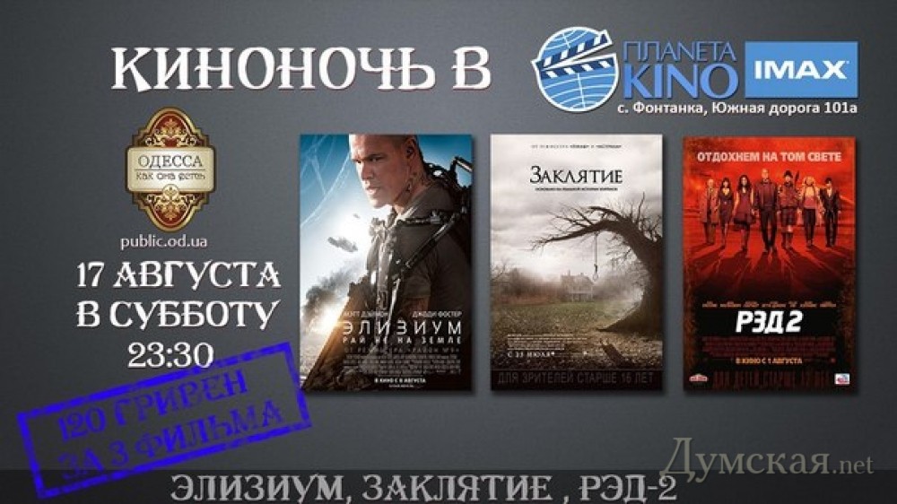 Одесситам предлагают посмотреть сразу три кино-новинки в течении одной ночи. В ночь с 17 на 18 августа в кинотеатре «Планета Кино» пройдет показ фантастического фильма «Элизиум», ужастика «Заклятие 2« и боевика «РЭД -2». Желающим предлагают зарегистрироваться тут. СМЕРТЬ РОСІЙСЬКИМ ОКУПАНТАМ! Помітили помилку? Виділяйте слова з помилкою та натискайте control-enter |