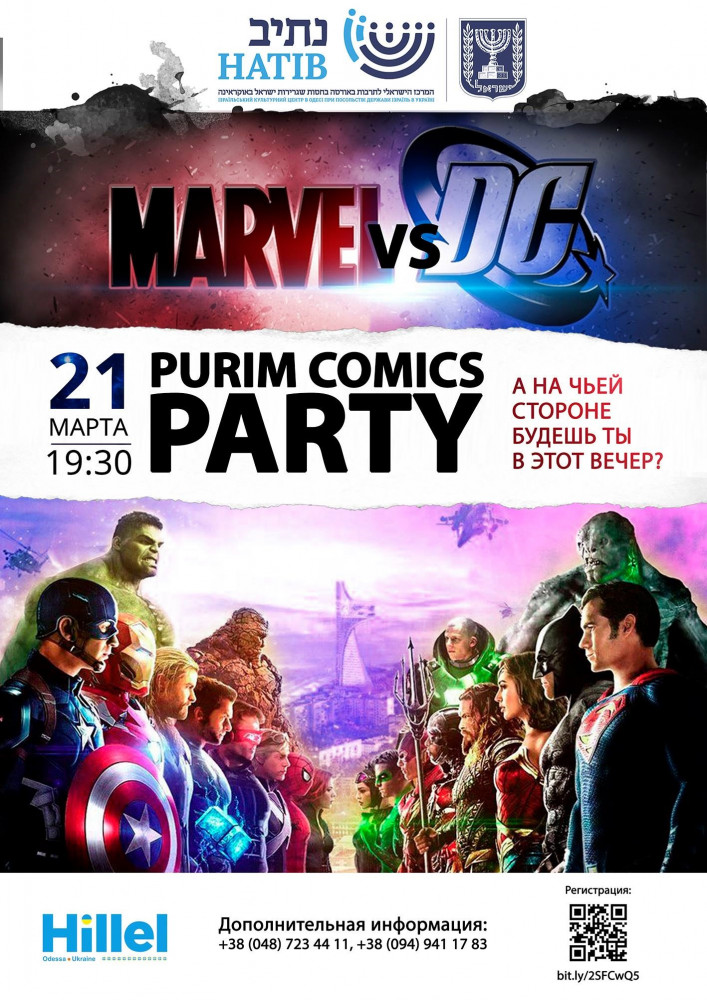21 марта Израильский культурный центр Натив устраивает в честь праздника Пурим костюмированную вечеринку в стиле комиксов. «Пурим – это всегда яркие и броские костюмы. В этом году Израильский культурный центр Натив совместно с ЕМЦ «Гилель» проведет вечеринку для всех от 18-ти до 35-ти лет в стиле комиксов Marvel и DC!» — отмечают организаторы. Гостей праздника ожидает шоу-программа, дискотека и, конечно же, конкурсы с призами. Purim Comics Party пройдет в четверг, 21 марта, в караоке-ресторане Vanity на Екатерининской, 23. Начало в 19:30. Вход — по предварительной регистрации. СМЕРТЬ РОСІЙСЬКИМ ОКУПАНТАМ! Помітили помилку? Виділяйте слова з помилкою та натискайте control-enter |