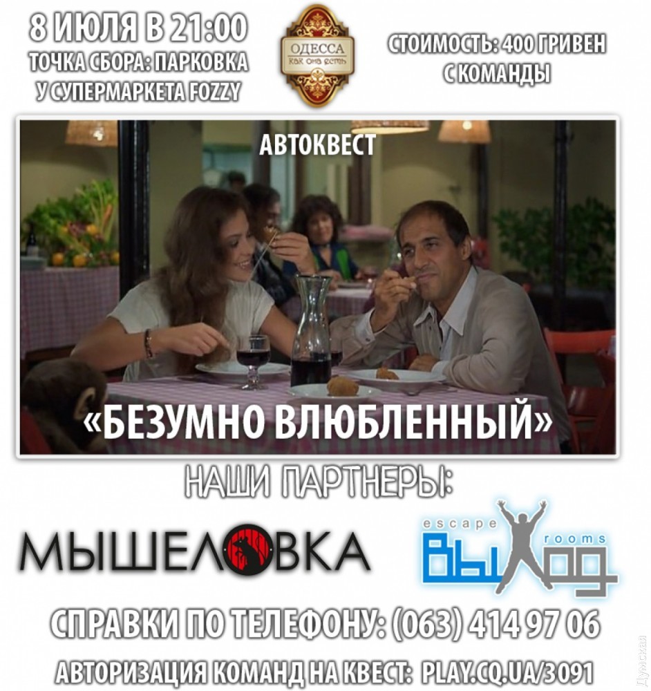 Любителей приключений ждет новый автоквест на тему фильма «Безумно влюбленный» (на правах рекламы)В эту субботу в Одессе состоится новая игра для любителей автомобильных приключений. Тема следующего городского квеста — «Безумно влюбленный». Участникам предстоит решать загадки, искать коды, перемещаться по городу и выполнять разные логические задания. «Возможна привязка к фильму «Безумно влюбленный». Советуем посмотреть»,- говорят организаторы игры. Автоквест состоится 8 июля в 20:30. К участию приглашаются команды от 2-х до 6 человек. Место старта — парковка магазина Fozzy на Балковской улице. Необходима предварительная регистрация. СМЕРТЬ РОСІЙСЬКИМ ОКУПАНТАМ! Помітили помилку? Виділяйте слова з помилкою та натискайте control-enter |