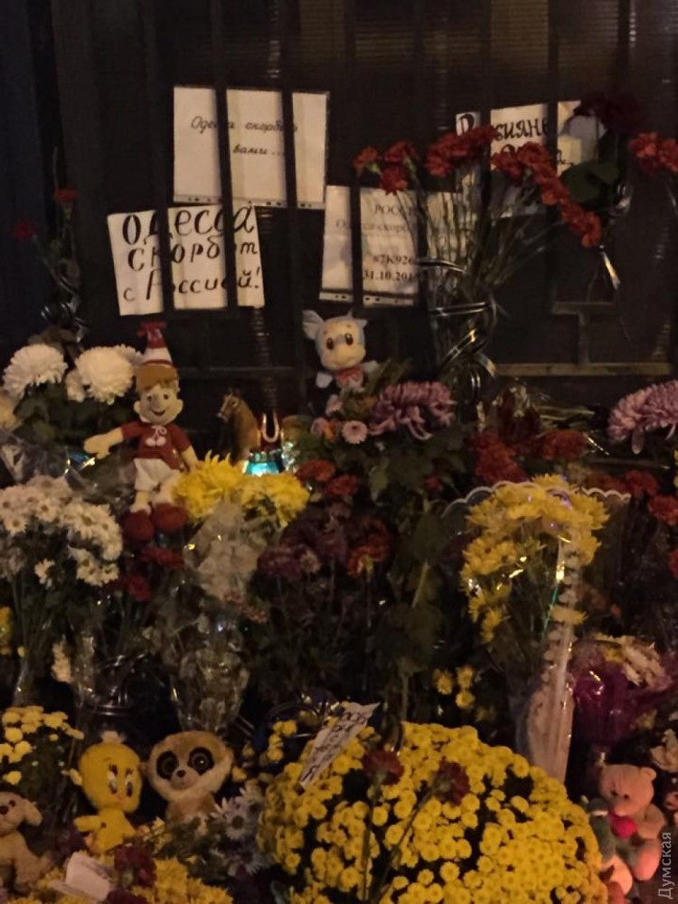 Одесситы несут к Генеральному консульству России в Одессе цветы, свечи и игрушки, выражая соболезнование в связи с авиакатастрофой лайнера Airbus, летевшего из Шарм-эш-Шейха в Санкт-Петербург. Об этом сообщает «Культурометр». Напомним, вчера самолет компании «Когалымавиа», на борту которого находились более 220 человек, вылетел из курортного города Шарм-эш-Шейх в Египте, а через некоторое время пропал с экрана радаров. Позже были обнаружены обломки лайнера. Большинство погибших – жители Санкт-Петербурга. Среди них - 17 детей. Фото Сергея Назарова СМЕРТЬ РОСІЙСЬКИМ ОКУПАНТАМ! Помітили помилку? Виділяйте слова з помилкою та натискайте control-enter |
