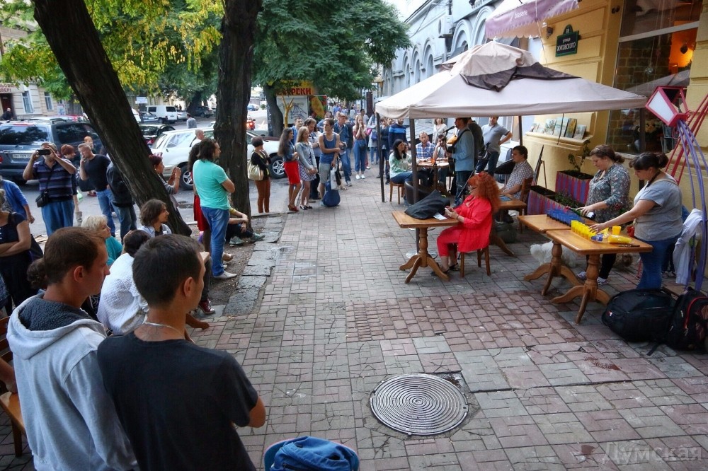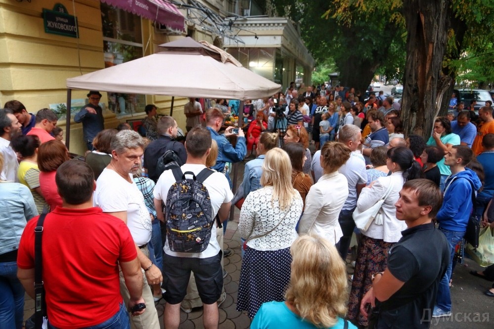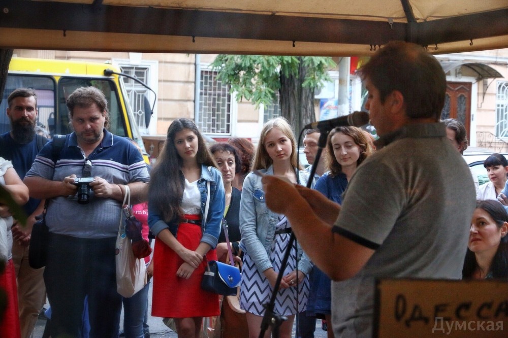 Одесские поэты, писатели, художники и музыканты выступили под стенами взорванного два дня назад кафе «у Ангеловых» на улице Жуковского.