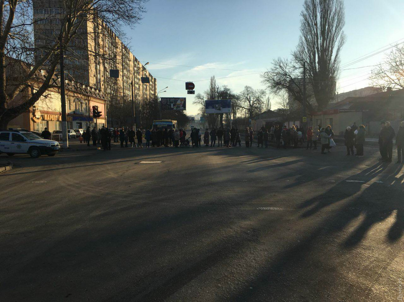 Люди возмущены тем фактом, что у них перекрыли воду и отключили отопление. Они цепочкой ходят по перекрестку и не дают водителям проезжать. В акции протеста участвуют даже дети, в том числе грудной младенец в коляске.