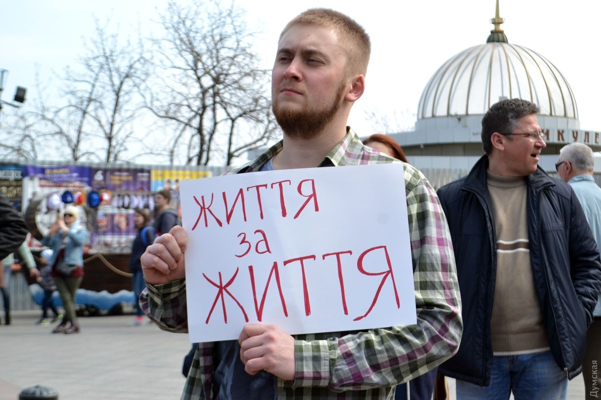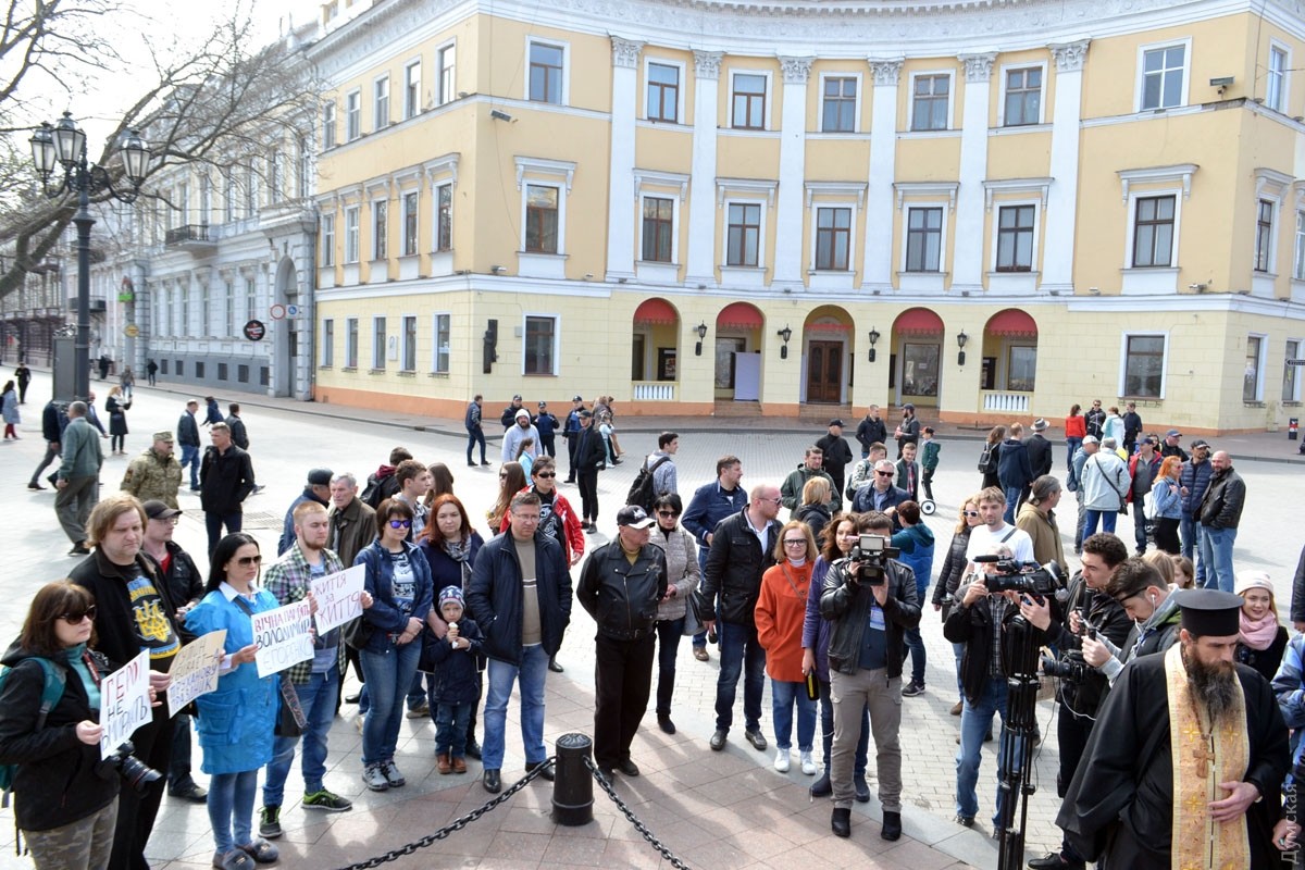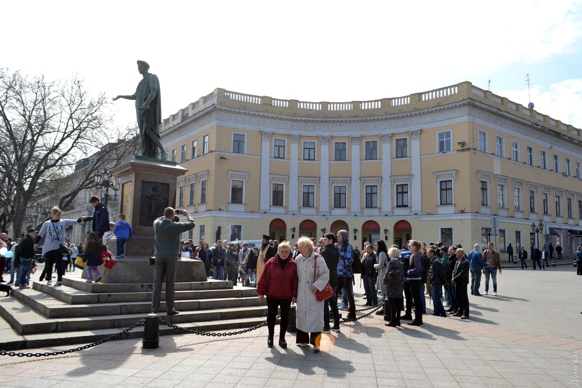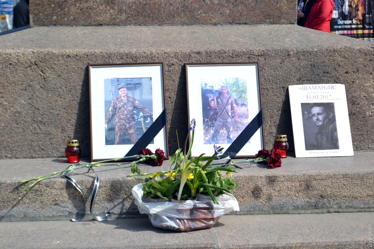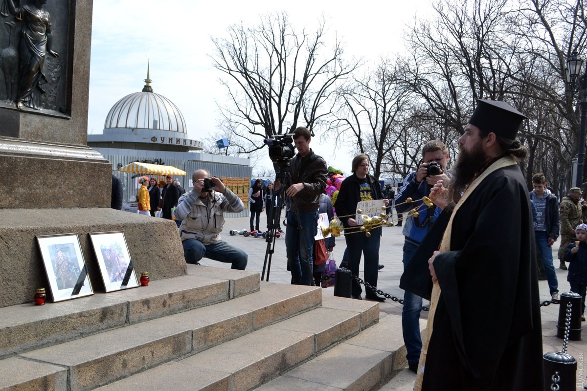 Несколько десятков горожан собрались у Дюка, чтобы почтить память солдата 44 артбригады, одессита Владимира Егоренко, павшего 29 марта на востоке Украины, и других жертв российской агрессии. Тело воина, напомним, сегодня ночью доставили в Одессу. Официальное прощание с ним состоится 3 апреля.