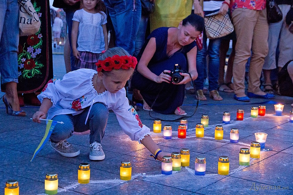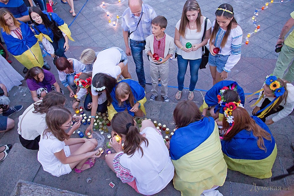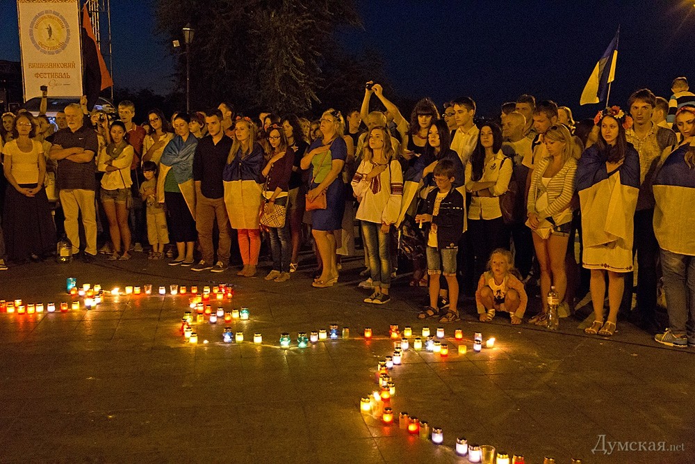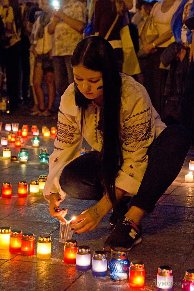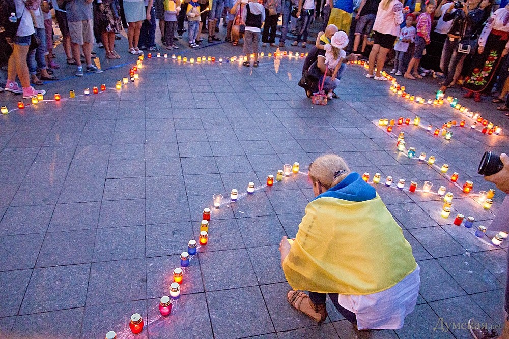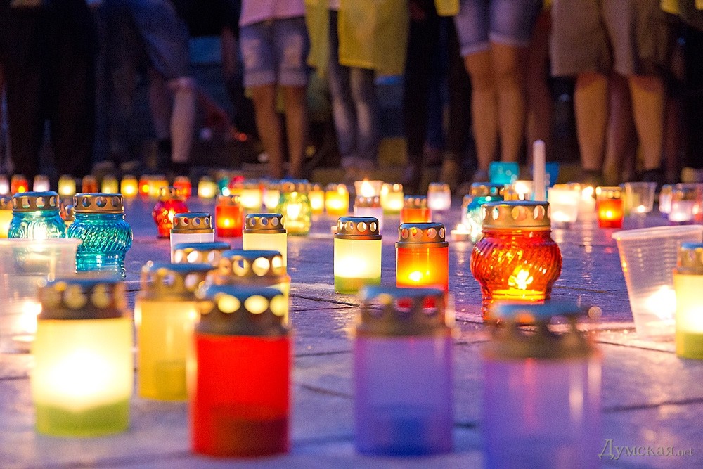 Около двухсот одесситов почтили сегодня память погибших защитников Украины. У памятника Дюку они выложили лампадками и свечами контур нашей страны, после чего была минута молчания.