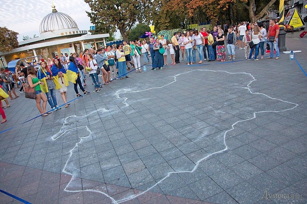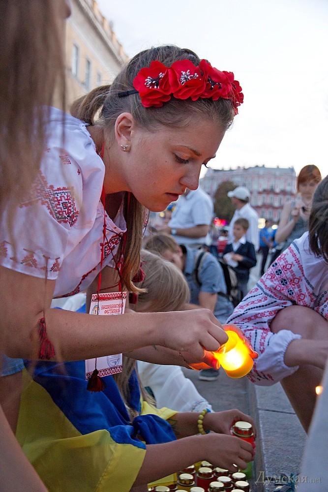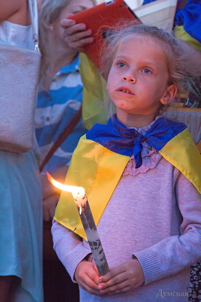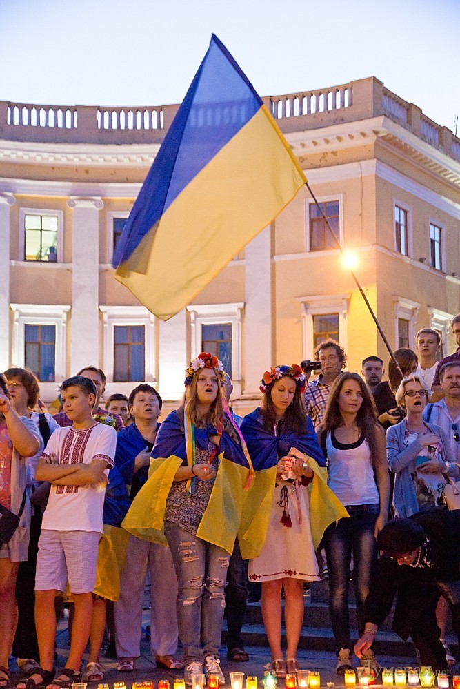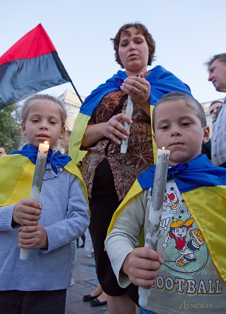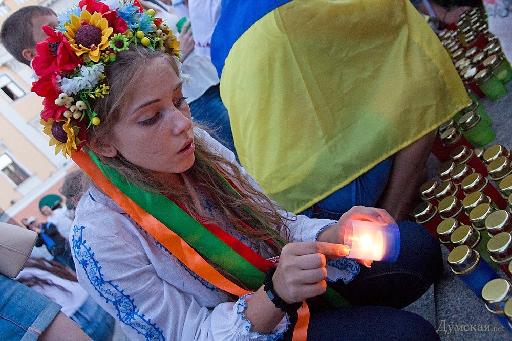 Около двухсот одесситов почтили сегодня память погибших защитников Украины. У памятника Дюку они выложили лампадками и свечами контур нашей страны, после чего была минута молчания.