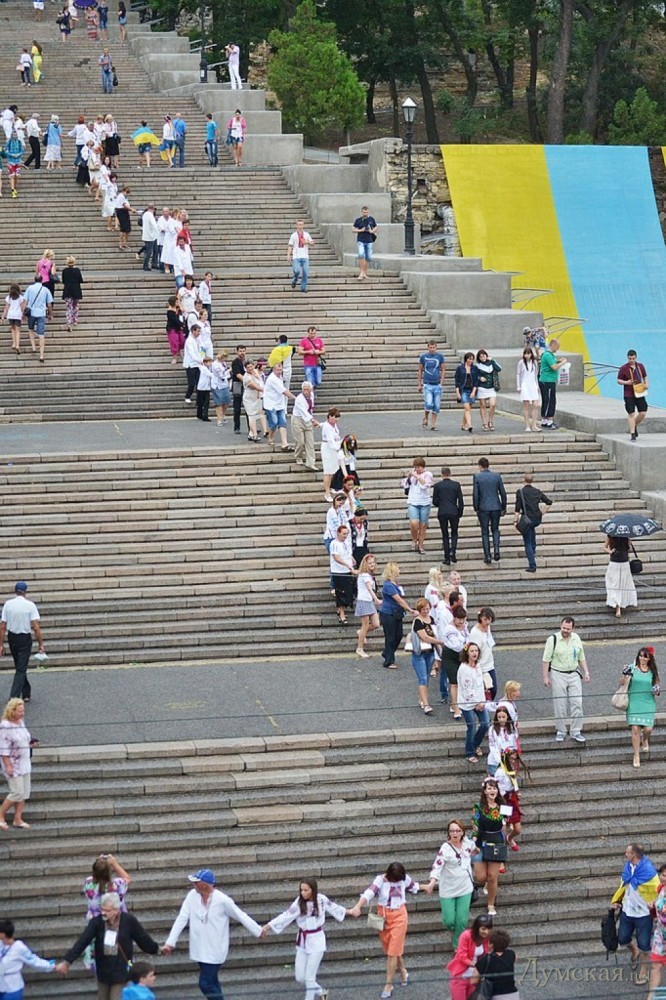 В воскресенье 1469 людей в вышиванках взялись за руки, образовав живую цепь от памятника Дюку к самому морю. Эта акция – визитка Вышиванкового фестиваля, который уже в шестой раз проходит в Одессе на Приморском бульваре ко Дню Независимости Украины.