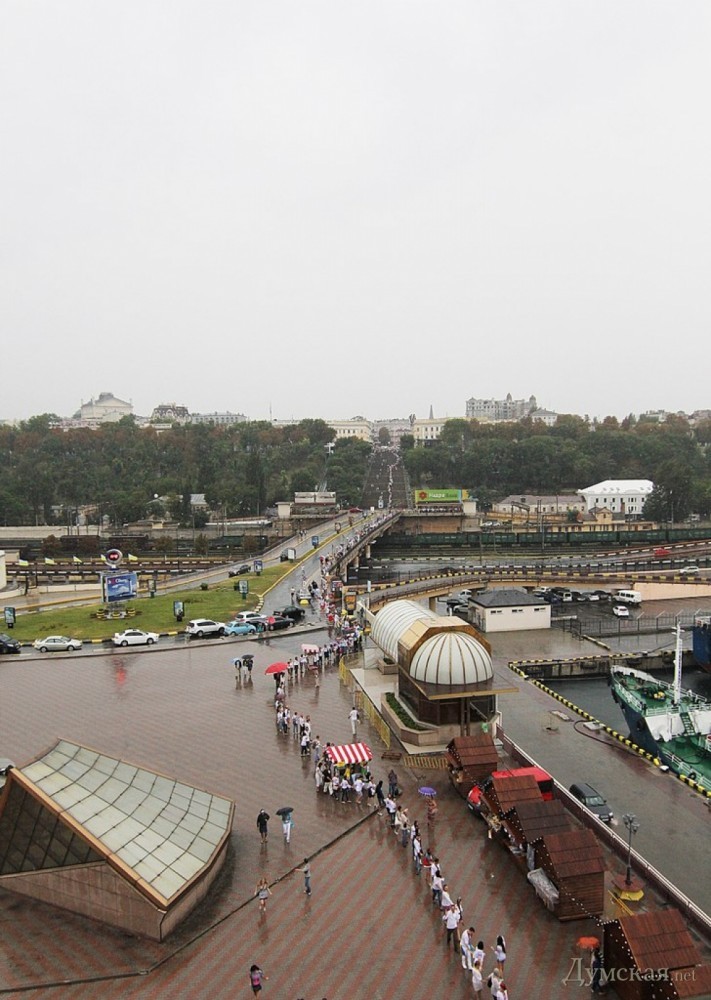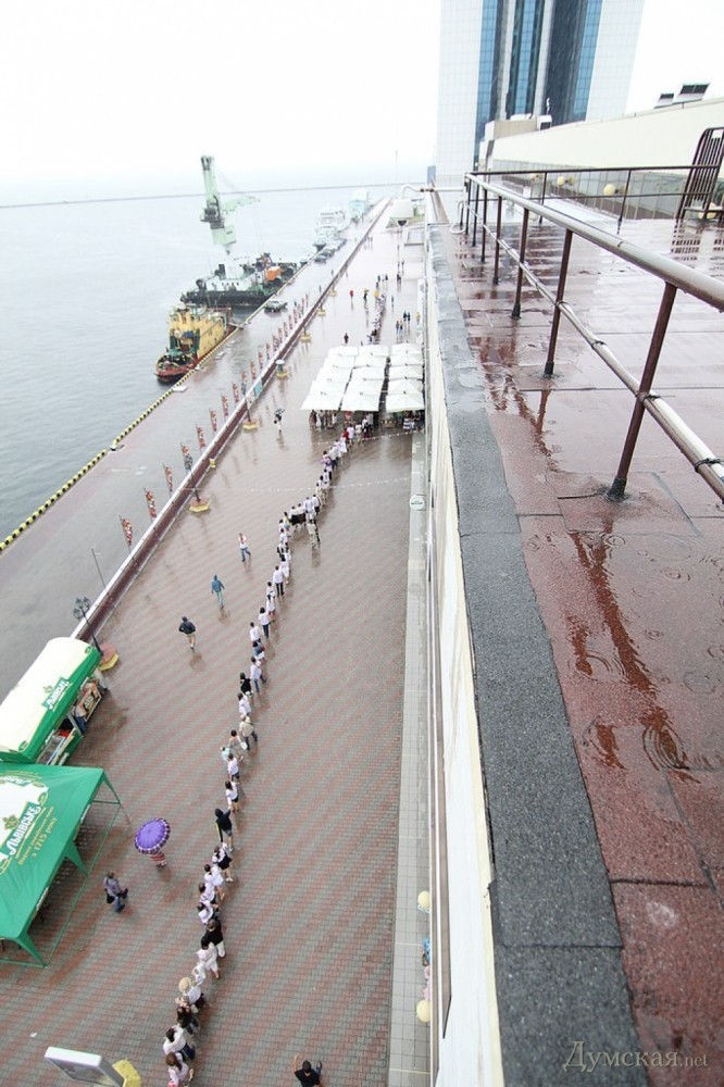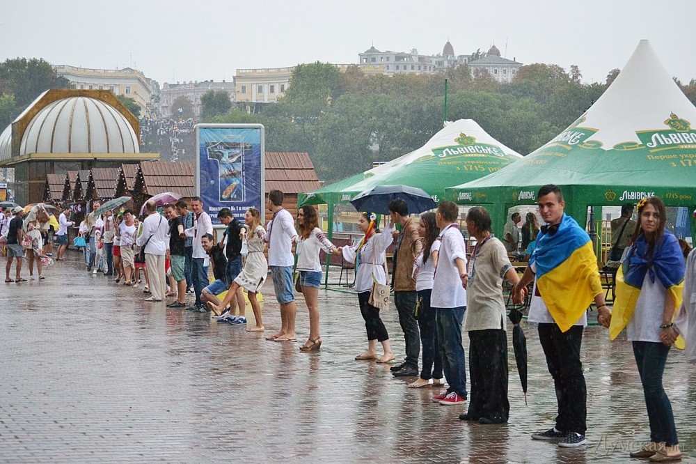 Сильный ливень, который начался на Приморском бульваре, не помешал одесситам побить рекорд вышиванок. Желающие принять участие в живой цепи ждали своей очереди даже под дождем. Одним из участников живой цепи стал сам Дюк – его тоже одели в вышиванку.