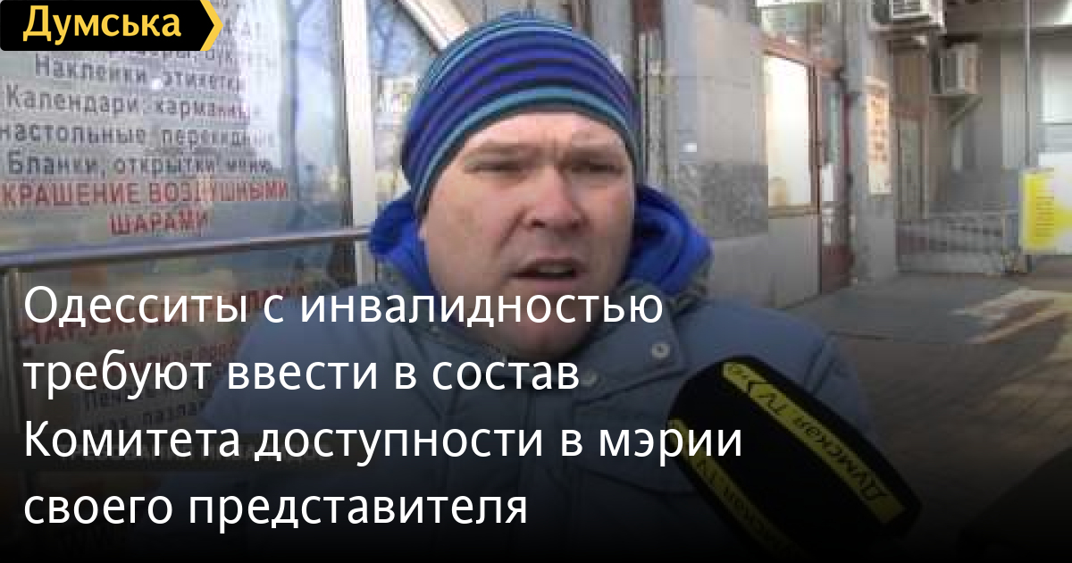 Одесситы с инвалидностью требуют ввести в состав «Комитета доступности» в мэрии своего представителяОдесситы с инвалидностью требуют ввести в состав «Комитета доступности» в мэрии своего представителя. Именно этот орган создает комфортные условия для людей с ограниченными физическими возможностями. Насколько наш город приспособлен для передвижения колясочников, — инспекцию в центре города провела наша съемочная группа. СМЕРТЬ РОССИЙСКИМ ОККУПАНТАМ! Заметили ошибку? Выделяйте слова с ошибкой и нажимайте control-enter Думская ТВ. Сюжеты: