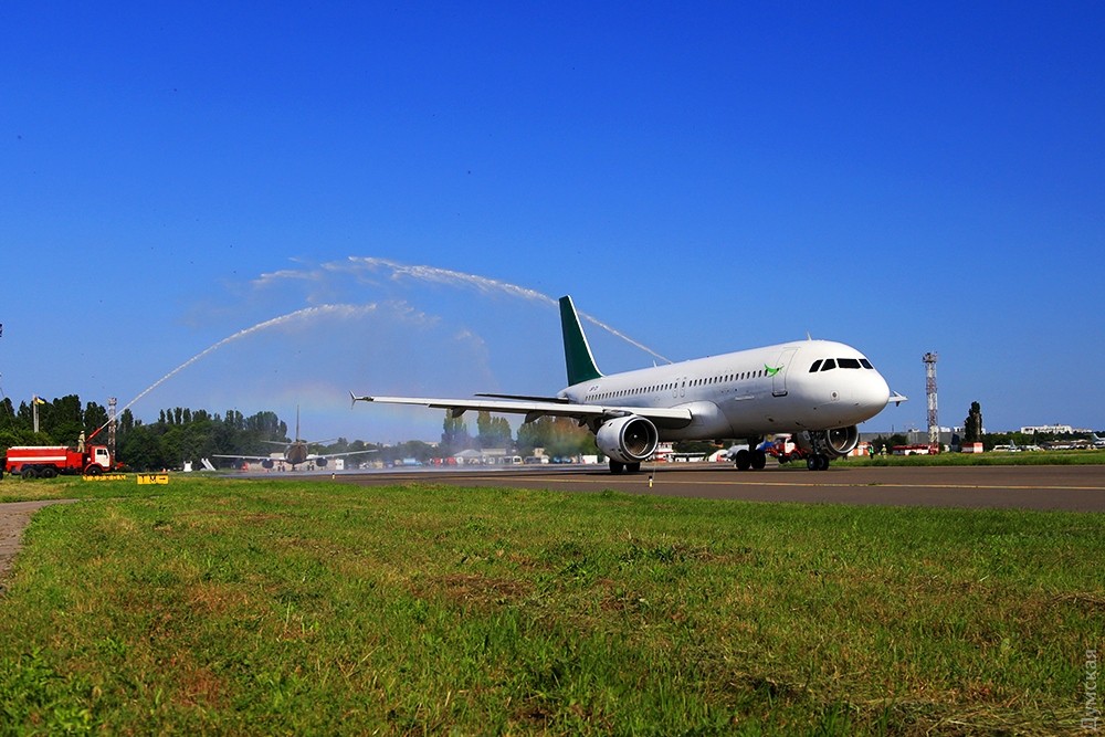 Рейс в Тиват впервые за историю одесского аэропорта провожали водяным салютом, а провожающие сквозь водяные брызги в лучах закатного солнца смогли увидеть радугу.