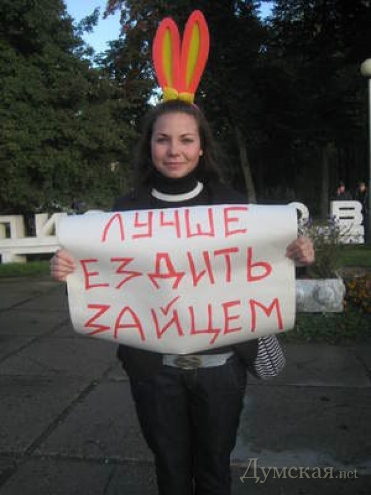 Ну если так, то катайтесь с повышенными тарифами. Надо хоть как-то выражать свою позицию. Беготня с плакатами — не в счет. Ведь повышают тарифы в городе не городские власти, а перевозчики. С городом они их только согласуют.