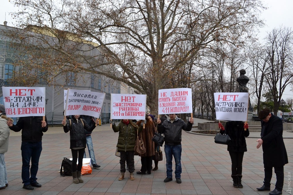 На фото слева у пикетчика читаем написанное на плакате: НЕТ 16-ти ЭТАЖКАМ НА ДАЧЕ КОВАЛЕВСКОГО! Из этого следует, что дома высотой до 15-го этажа строить там они не возражают. Депутаты, вы уж там в горсовете подсуетитесь, пока плакат не переписали. А то потом они будут утверждать, что были против и домов от одного до 15-ти этажей. ))