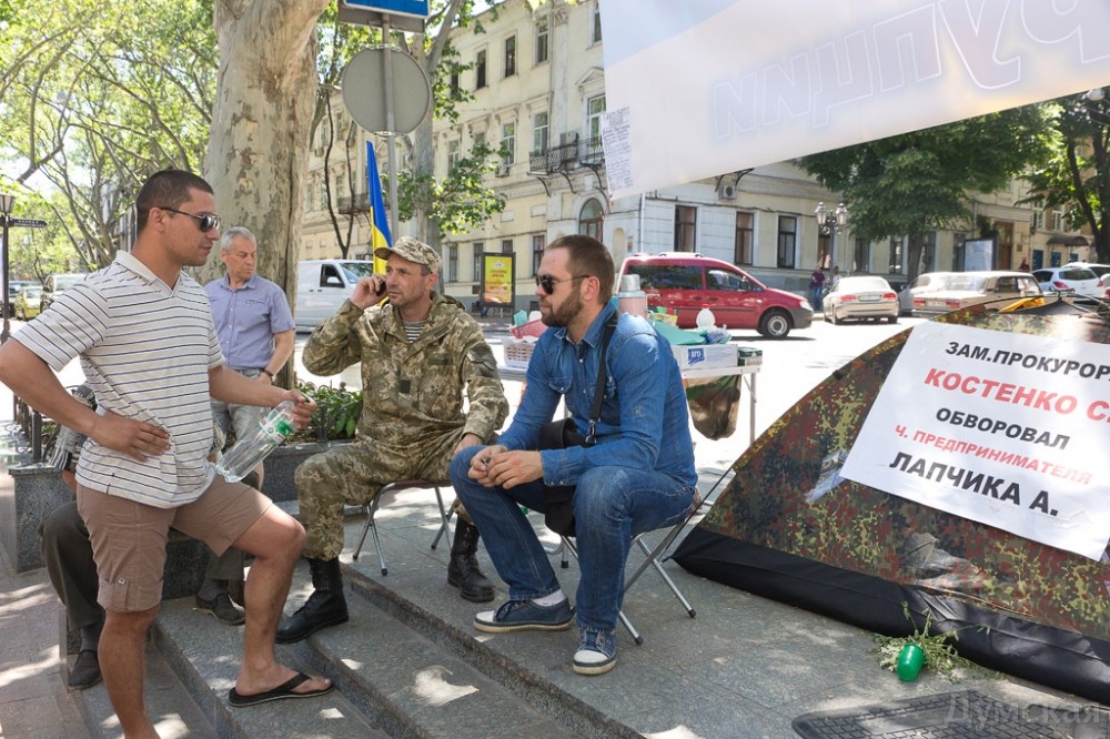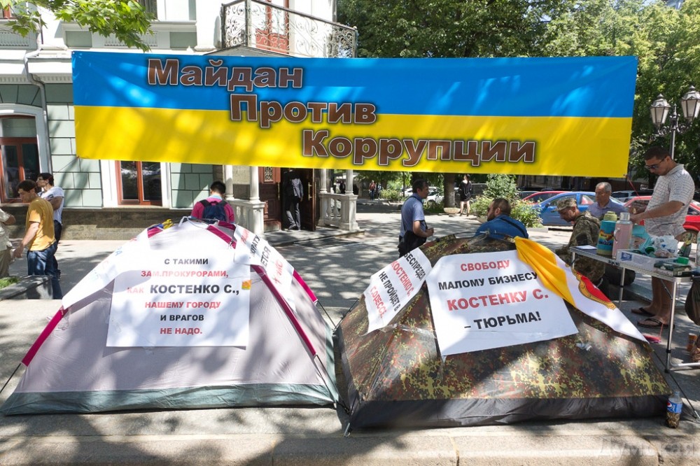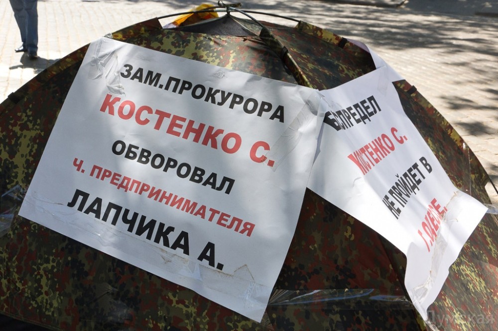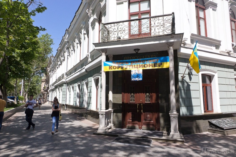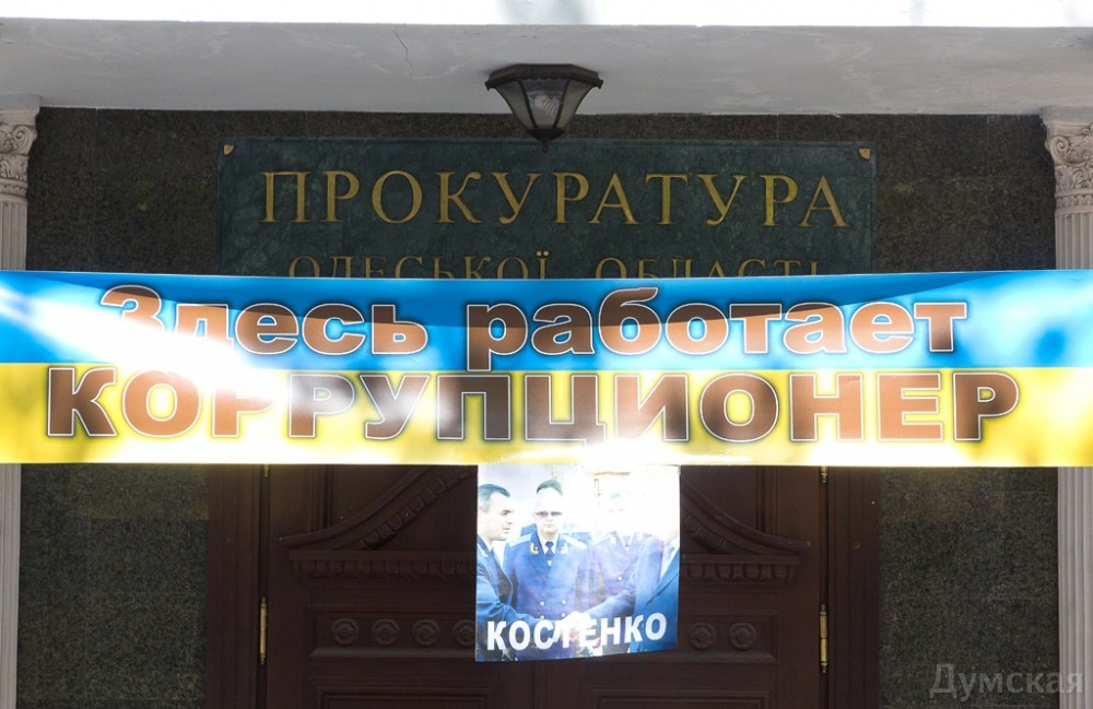 Уже три дня группа активистов пикетирует здание прокуратуры Одесской области на Пушкинской улице с требованием наказать причастных к коррупционным схемам сотрудников ведомства, в частности, зампрокурора Сергея Костенко. Пикетчики разбили у здания две палатки и украсили вход в прокуратуру транспарантом «Здесь работает коррупционер».