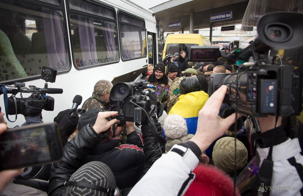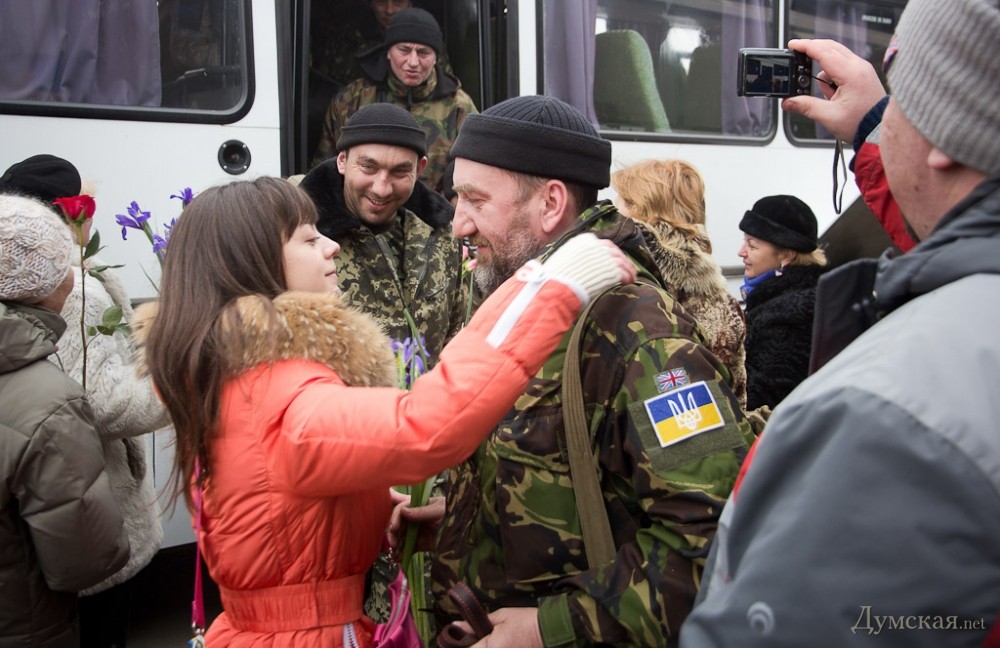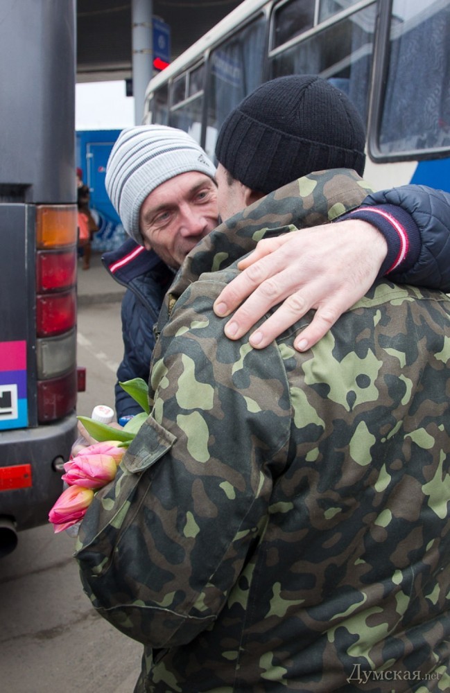 Военнослужащие 28-й отдельной механизированной бригады в течение последних нескольких дней приезжают в рамках ротации на родную одесскую землю — отдохнуть от ратных дел на востоке Украины. Всего в отпуск должно прибыть 200 бойцов. Сегодня на автостанции «Привоз» высадилась из автобуса очередная группа фронтовиков.