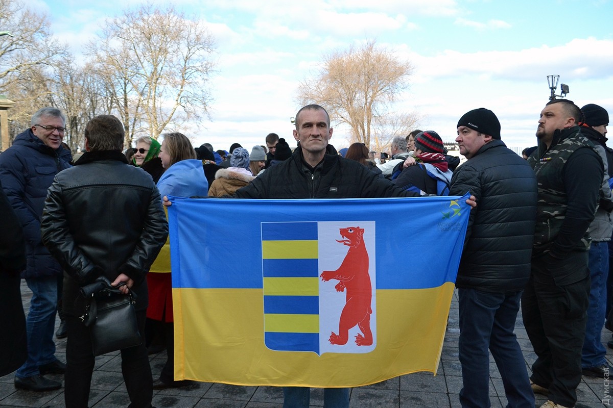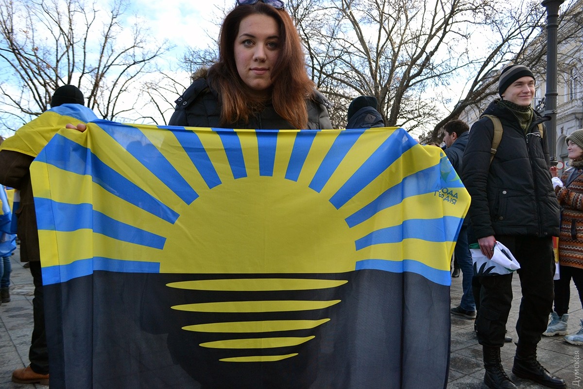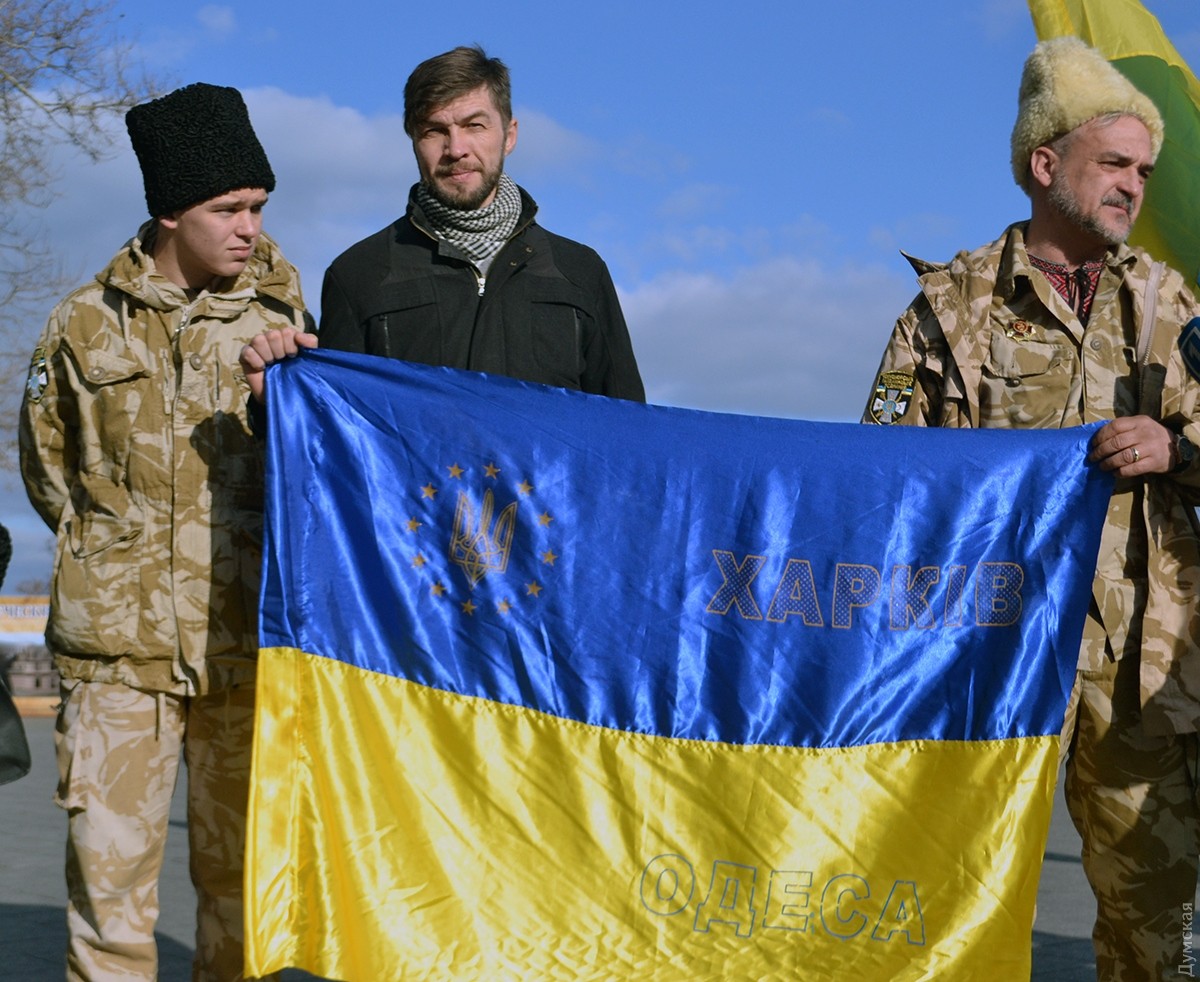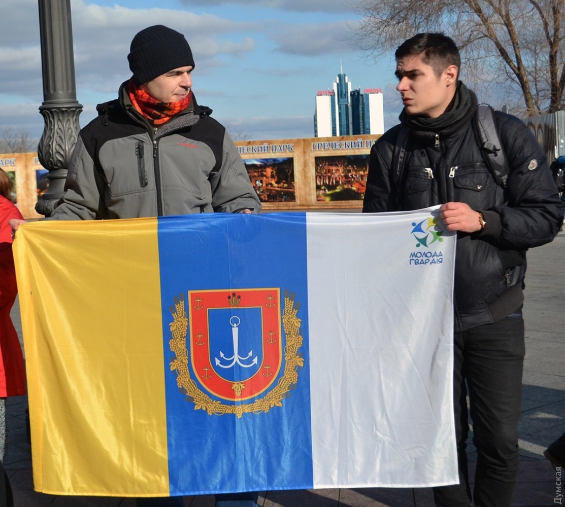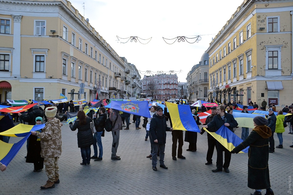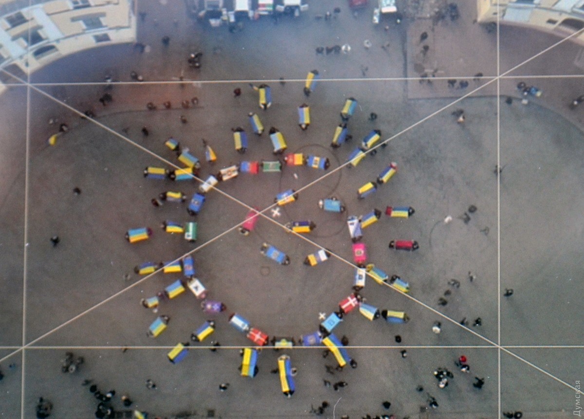 Активисты выстроились на Приморском бульваре с флагами областей Украины, а после сформировали солнце в виде спирали, где сердцевина — флаги областей и Крыма, а лучи – флаги Украины.