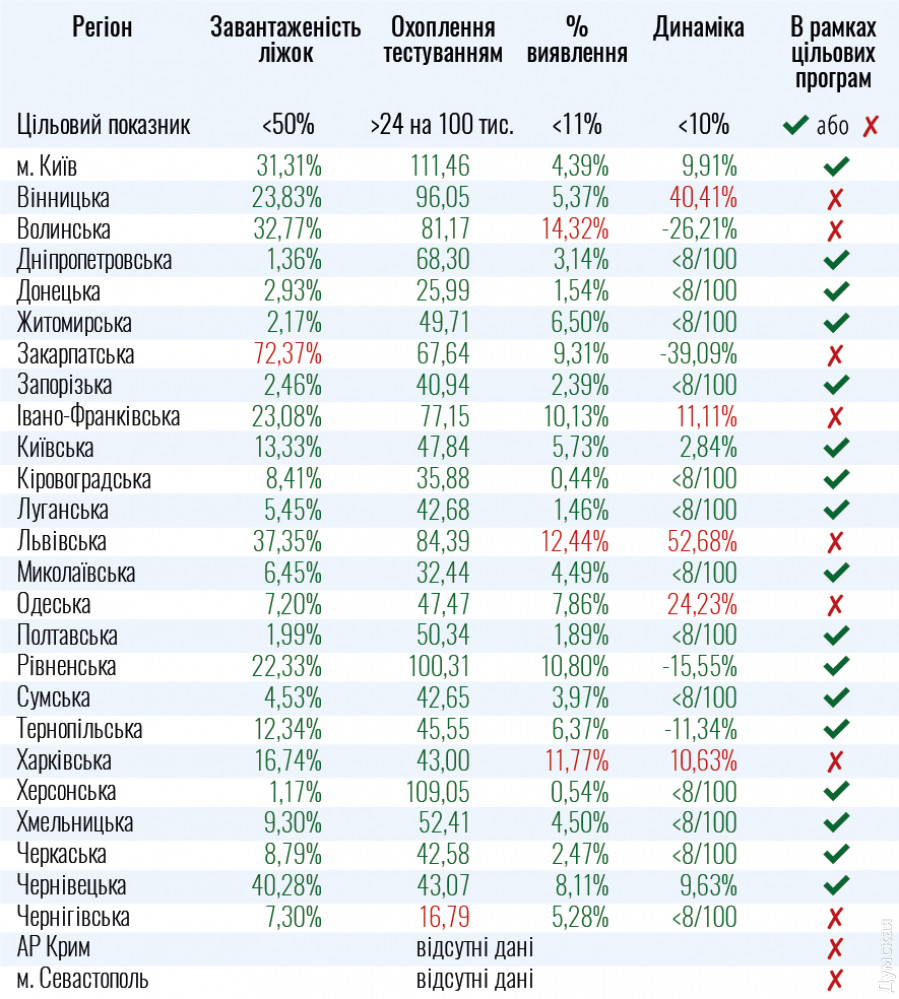 В большинстве не соответствует минимально допустимому показатель динамики заболевания: в Одесской он составляет 24,23% при норме 10 и меньше процентов.