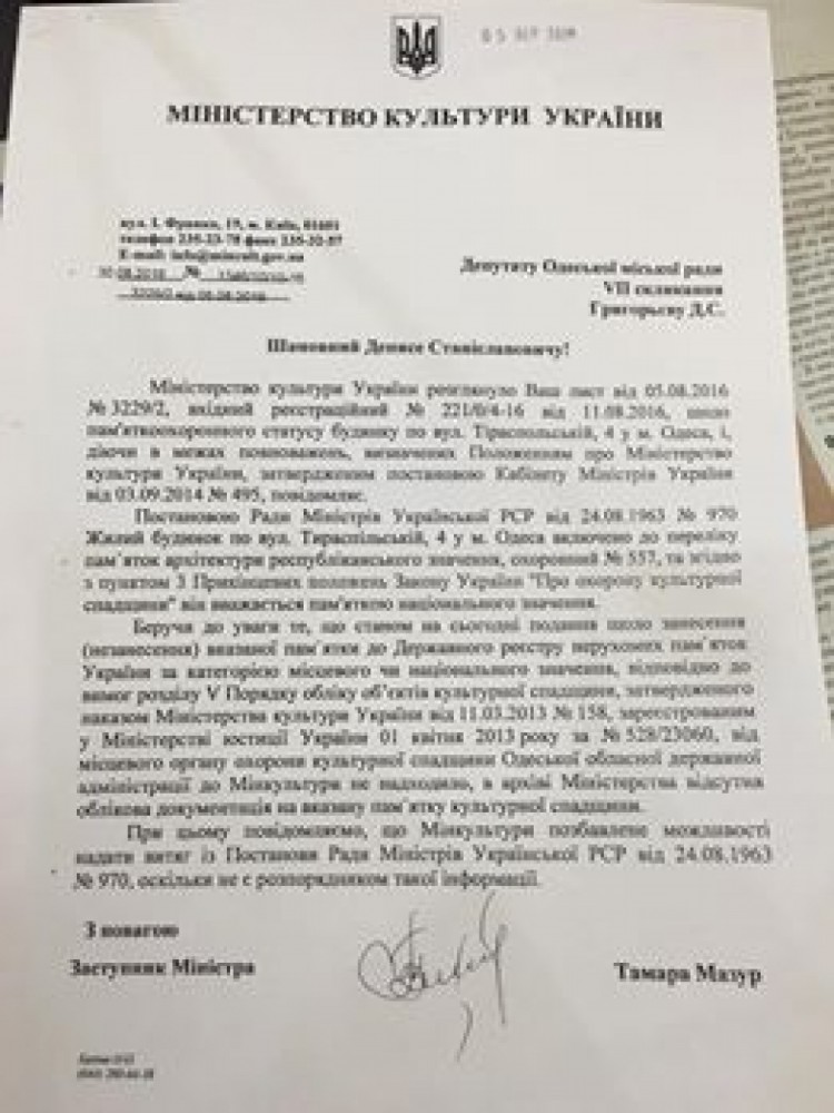 Спустя три года Одесская мэрия потребует отменить разрешение на реконструкцию дворца КамоОдесский горсовет инициирует отмену разрешений на реконструкцию дворца Камо, которая началась еще в апреле 2013 года. Соответствующее распоряжение в ходе сегодняшнего аппаратного совещания дал и.о. мэра Анатолий Орловский. Депутат городского совета Денис Григорьев обратился с просьбой возобновить работу комиссии по вопросу реконструкции здания на Тираспольской площади в связи с тем, что Министерство культуры Украины предоставило документ, согласно которому оно является памятником архитектуры. Депутат подчеркнул, что таким образом, реконструкция, в ходе которой в здании были сделаны четыре дополнительных входа, пристроены мансарда и лестница, является незаконной. «Мэр уже отдавал распоряжение заняться этим вопросом, но у нас была заминка, из-за того что не было документов о принадлежности здания к памятникам архитектуры. Теперь документ есть, и я прошу возобновить работу комиссии», — отметил депутат. Начальник управления по вопросам охраны объектов культурного наследия Андрей Шелюгин в свою очередь подчеркнул, что это - памятник архитектуры национального значения, и, значит, находится вне полномочий городских властей. «Мы проинформировали органы областной администрации и Министерство культуры, так как только оно может повлиять на приведение здания в первоначальный вид», — сказал чиновник. Анатолий Орловский ответил, что муниципалитет все равно должен заняться решением этой проблемы и инициировать отмену разрешений: «Мы — не заслуженные работники железной дороги, чтобы переводить стрелки. Мы должны решать проблему, раз уже есть документы, что это памятник», — заявил он. Напомним, дом в стиле классического итальянского палаццо возведен в 1837-м году архитектором Джордано Торричелли. СМЕРТЬ РОСІЙСЬКИМ ОКУПАНТАМ! Помітили помилку? Виділяйте слова з помилкою та натискайте control-enter