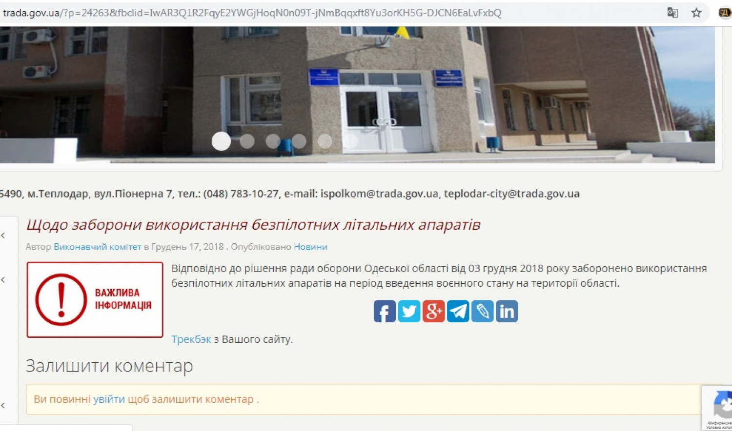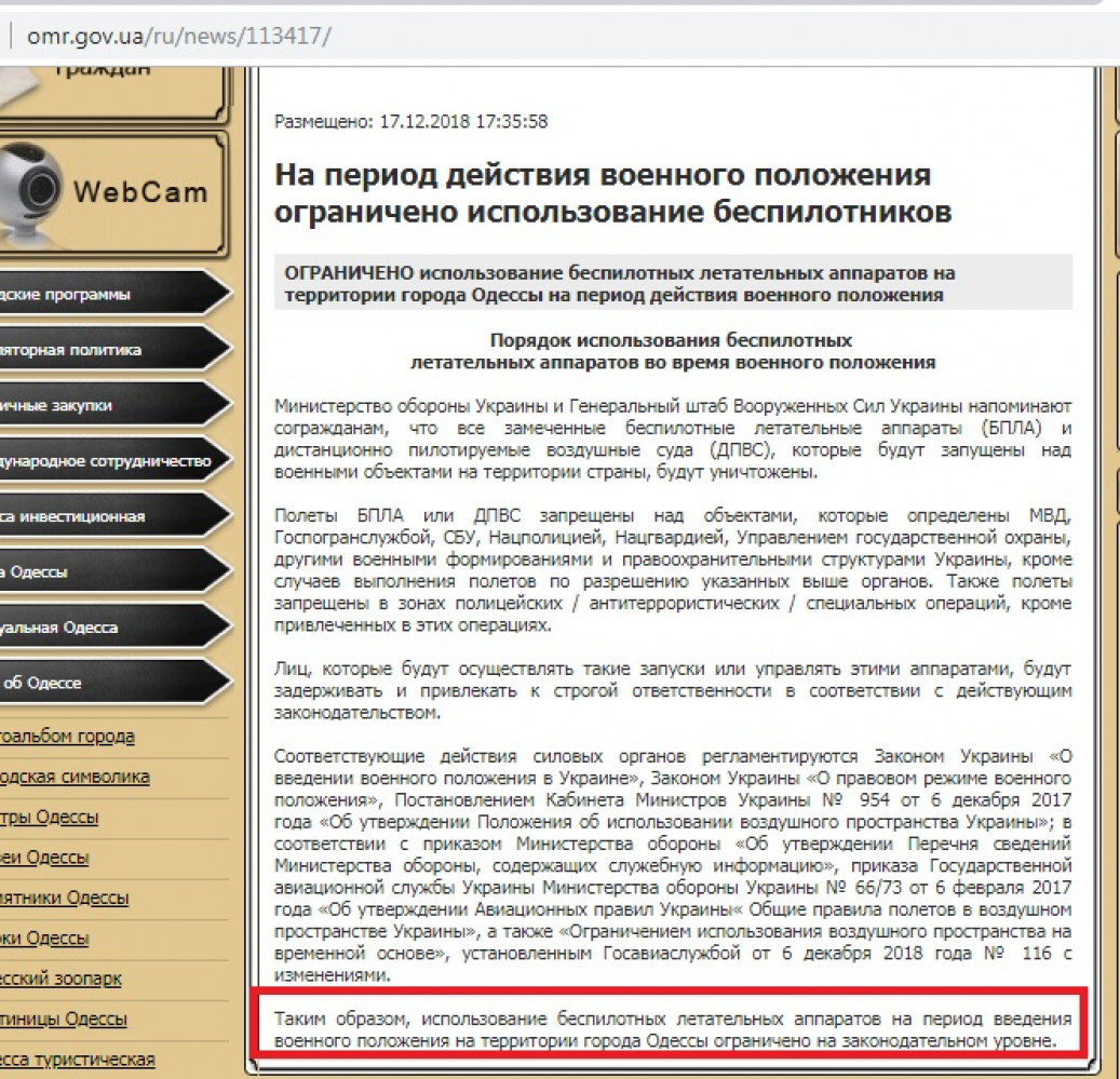 Так, пресс-служба Теплодарского горсовета объявила о категорическом запрете БПЛА: «Согласно решению совета обороны Одесской области от 3 декабря 2018, запрещено использование беспилотных летательных аппаратов на период введения военного положения на территории области».