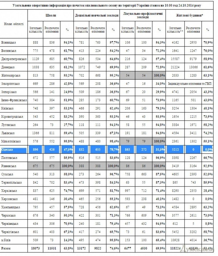 С объектами социальной сферы дела обстоят лучше. В области уже отапливается 426 школ (47%), 655 детских садиков (78,7%), 272 лечебно-профилактических учреждения (31,5%). В целом по Украине к отоплению подключены 63,8% школ, 74,6% дошкольных учреждений, 69,9% больниц и 53,4% жилого фонда. Из регионов лидером является Ровненская область, где подключены 100% учреждений социальной сферы и 92,5% жилых домов.