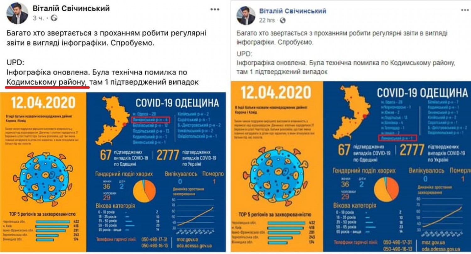Одесская область: информация вице-губернатора о четырех случаях COVID-19 в Лиманском районе не подтвердиласьНеразбериха случилась со статистикой по заболеваемости COVID-19 в Одесской области. Так, 12 апреля вице-губернатор Виталий Свичинский сообщил о четырех подтвержденных случаях в Лиманском районе. На вопросы жителей о том, в каких селах зафиксированы эти случаи, Свичинский не ответил, но изменил цифры в инфографике, указав, что в Лиманском районе — один заболевший. При этом на словах он написал, что техническая ошибка произошла в данных из другого района, Кодымского, что еще больше запутало ситуацию. В оперативном штабе Лиманского района местным журналистам не подтвердили даже одного случая. Свичинский позже написал, что этого одного пациента перенесли в статистику по Одессе: «Что касается Лиманского района, то один пациент короткий период проживал именно там, но потом переехал в Одессу, поэтому мы его статистически считаем за Одессой». После всех исправлений в статистике ОГА за 13 апреля в Лиманском районе нет случаев, в Кодымском значится один, в Одессе — 30. Всего в области зарегистрировано 69 случаев. СМЕРТЬ РОСІЙСЬКИМ ОКУПАНТАМ! Помітили помилку? Виділяйте слова з помилкою та натискайте control-enter