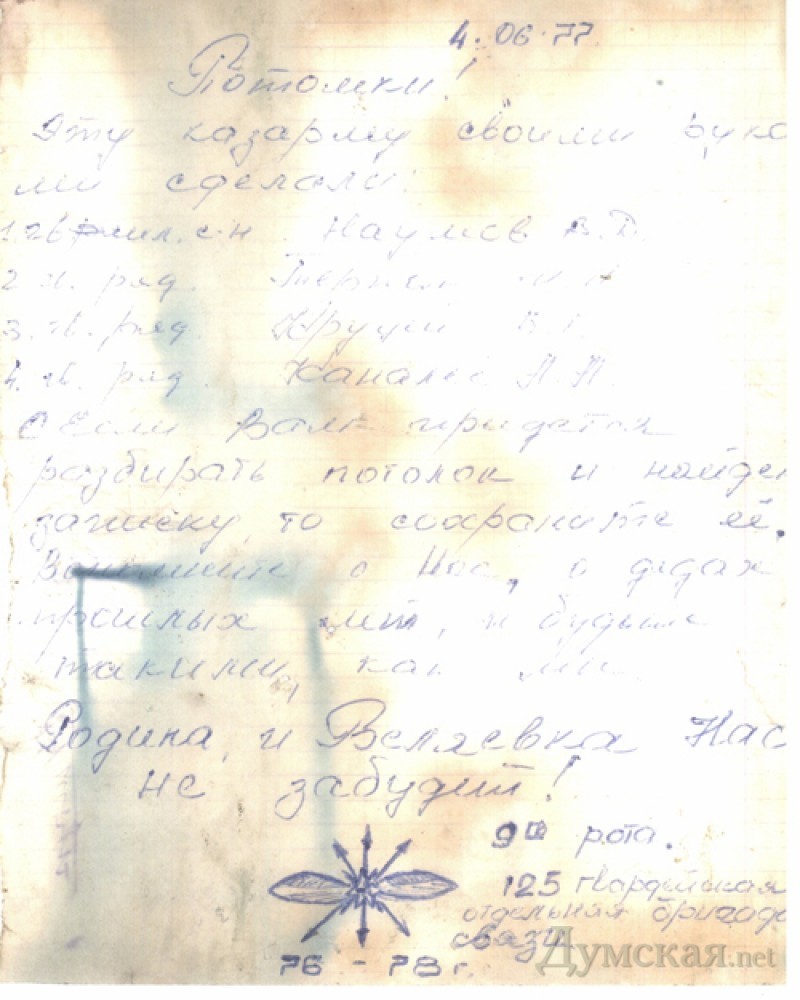 Необычной находкой ознаменовалось начало работ по перестройке в детский садик на 150 мест бывшей казармы в райцентре Беляевка Одесской области. Как рассказали «Думской» в мэрии города, рабочие, разбиравшие потолок второго этажа здания, обнаружили послание строителей казармы, датированное 4 июня 1977 года.