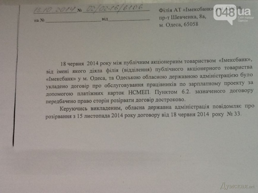 Игорь Палица закрыл счета работников Одесской облгосадминистрации в «Имексбанке». Сайт «048» опубликовал документ, согласно которому с 15 ноября будет прекращен договор на перечисление зарплаты через банк Леонида Климова. Договор расторгается досрочно — в связи с распоряжением с распоряжением Кабинета Министров Украины, согласно которому государственные органы власти обязаны вести расчеты через государственные «Ощадбанк» и «Эксимбанк». Отметим, что областная администрация сотрудничает с «Имэксбанком» почти полтора десятилетия. СМЕРТЬ РОСІЙСЬКИМ ОКУПАНТАМ! Помітили помилку? Виділяйте слова з помилкою та натискайте control-enter