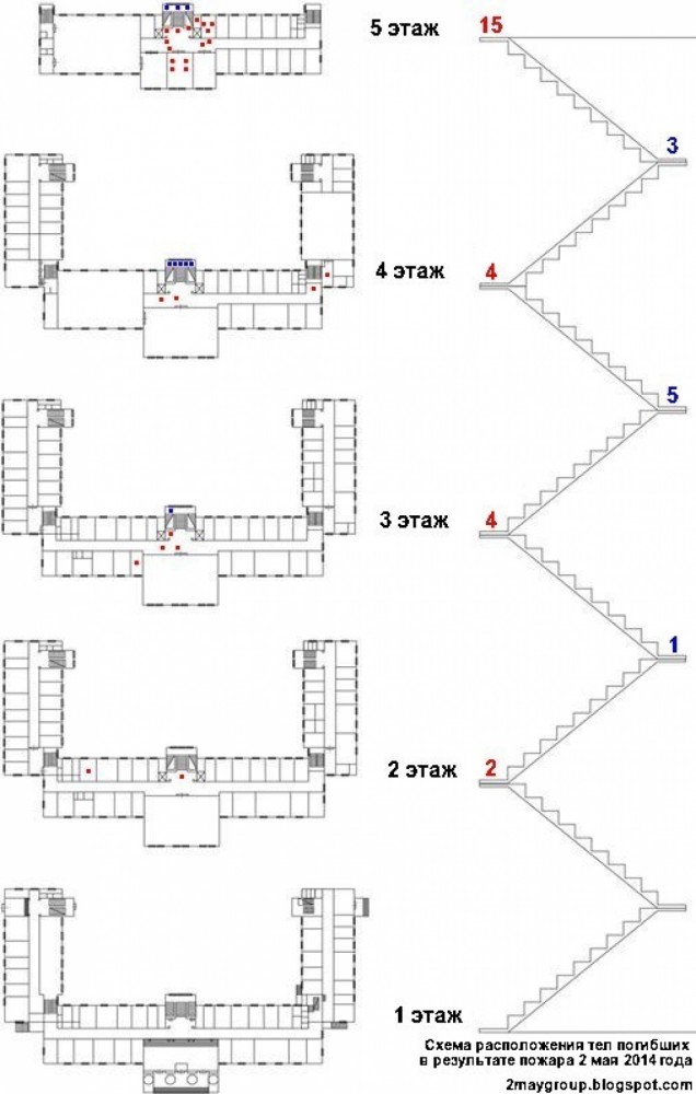Недавно «Группа 2 мая» впервые обнародовала официальный список погибших. Схема расположения тел и динамическая модель пожара, обнародованная на прошлой неделе, дают возможность объективно анализировать события в Доме профсоюзов. Так, сопоставление схемы с картой температур и задымления позволяет увидеть, что тела погибших находятся в вестибюлях и на лестничных пролетах, где температура составляла сотни градусов, а также на пятом этаже, где наблюдалось наибольшее задымление. В боковых флигелях, где не было высоких температур и дыма, тел погибших обнаружено не было.