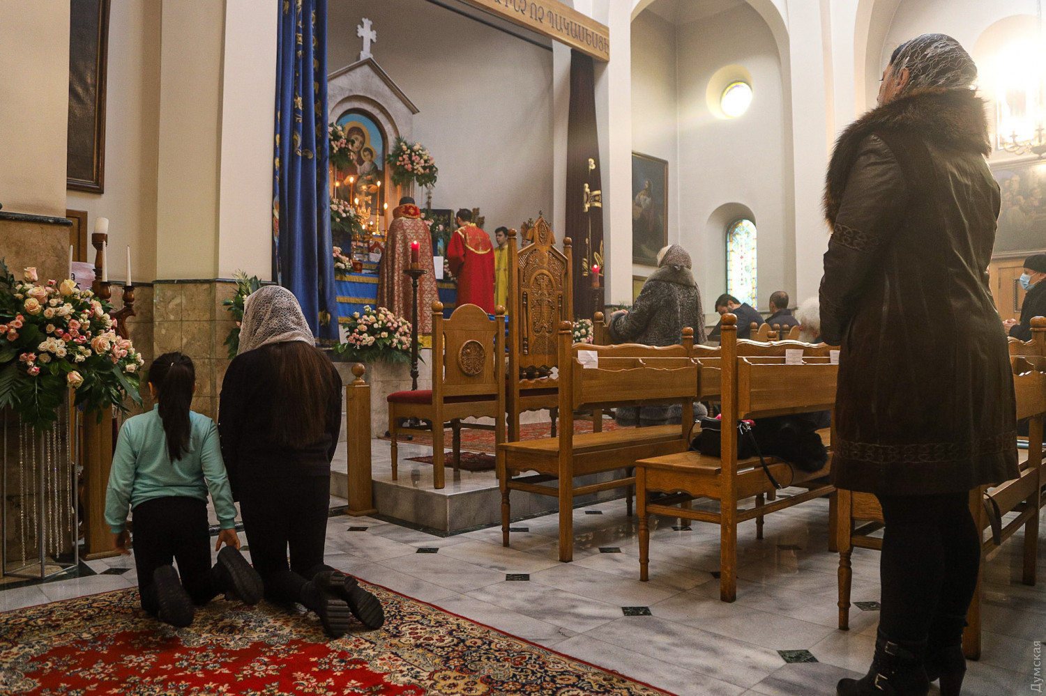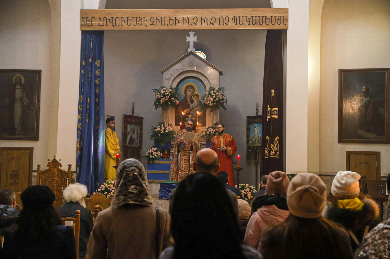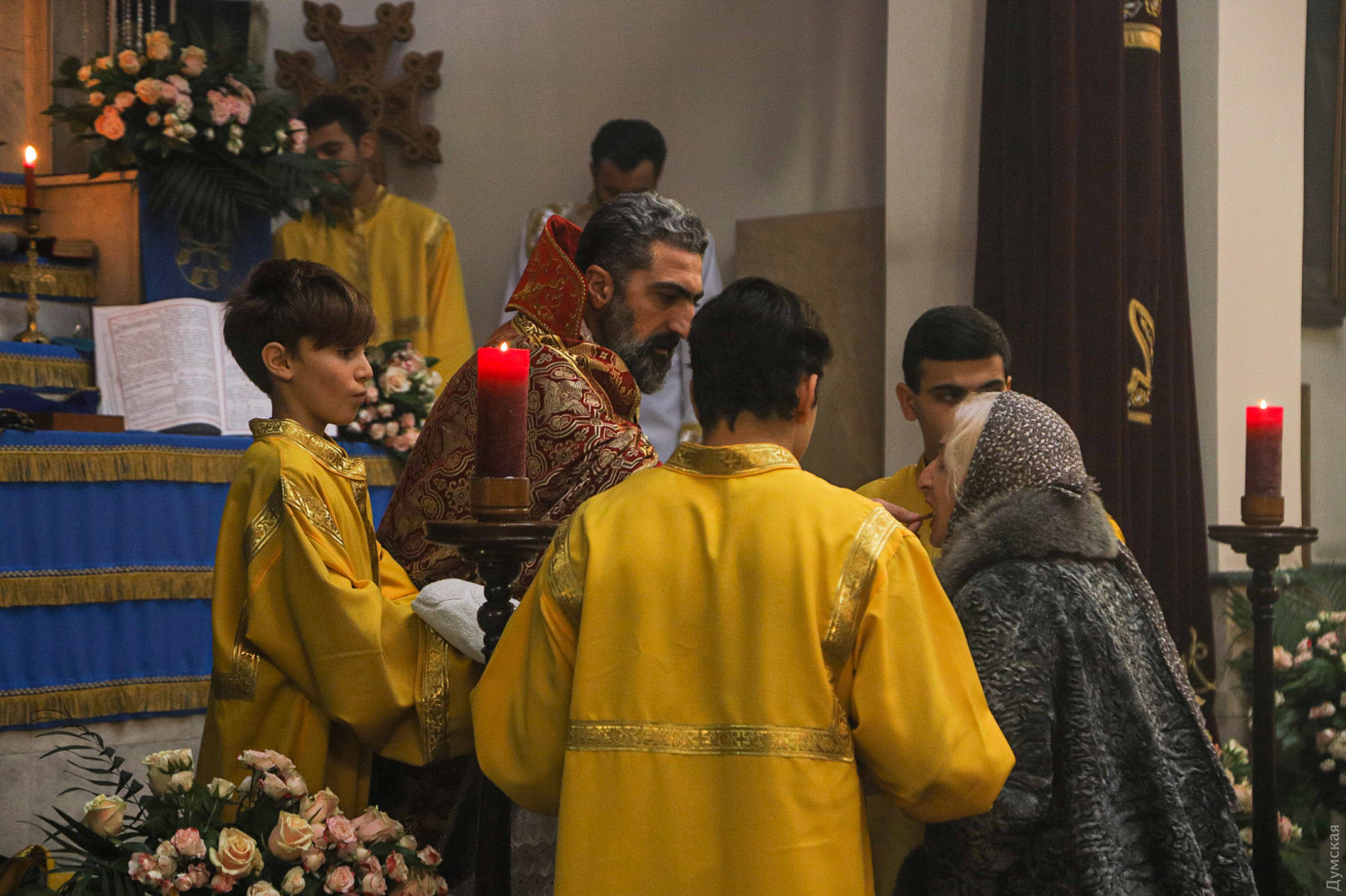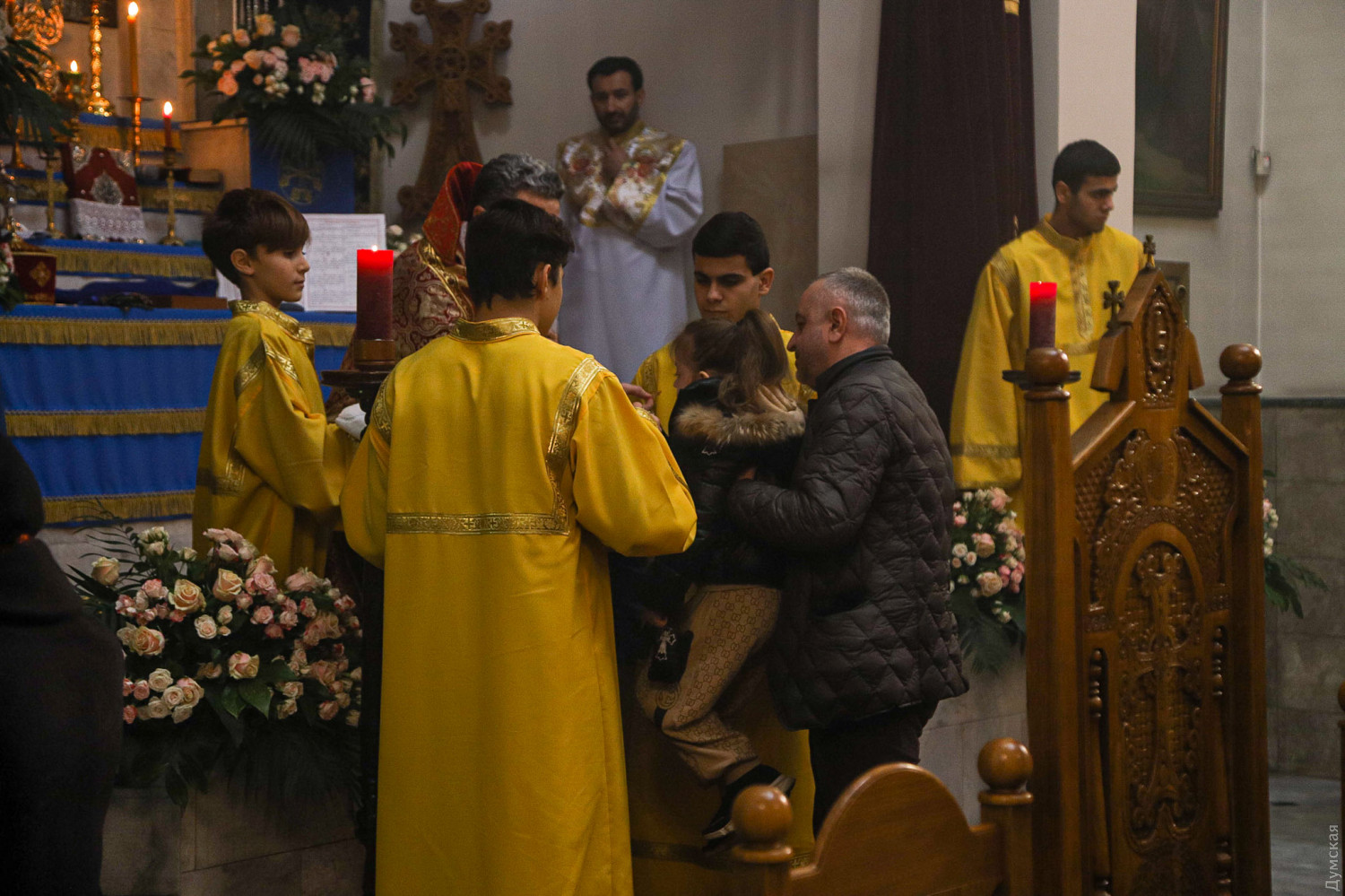 Рождество Христово отмечают сегодня, на день раньше православных, греко-католиков и части протестантов, верующие Армянской апостольской церкви. Корреспондент «Думской» побывал на рождественской литургии в одесском армянском храме Святого Григория Просветителя, что на Гагаринском плато. Служба началась примерно в 11 часов. Все, что происходит в храме, транслируется через громкоговорители в небольшой сквер, примыкающий к церкви. Ближе полудню небольшое здание было полностью заполнено. Многие пришли большими семьями, с детьми.
